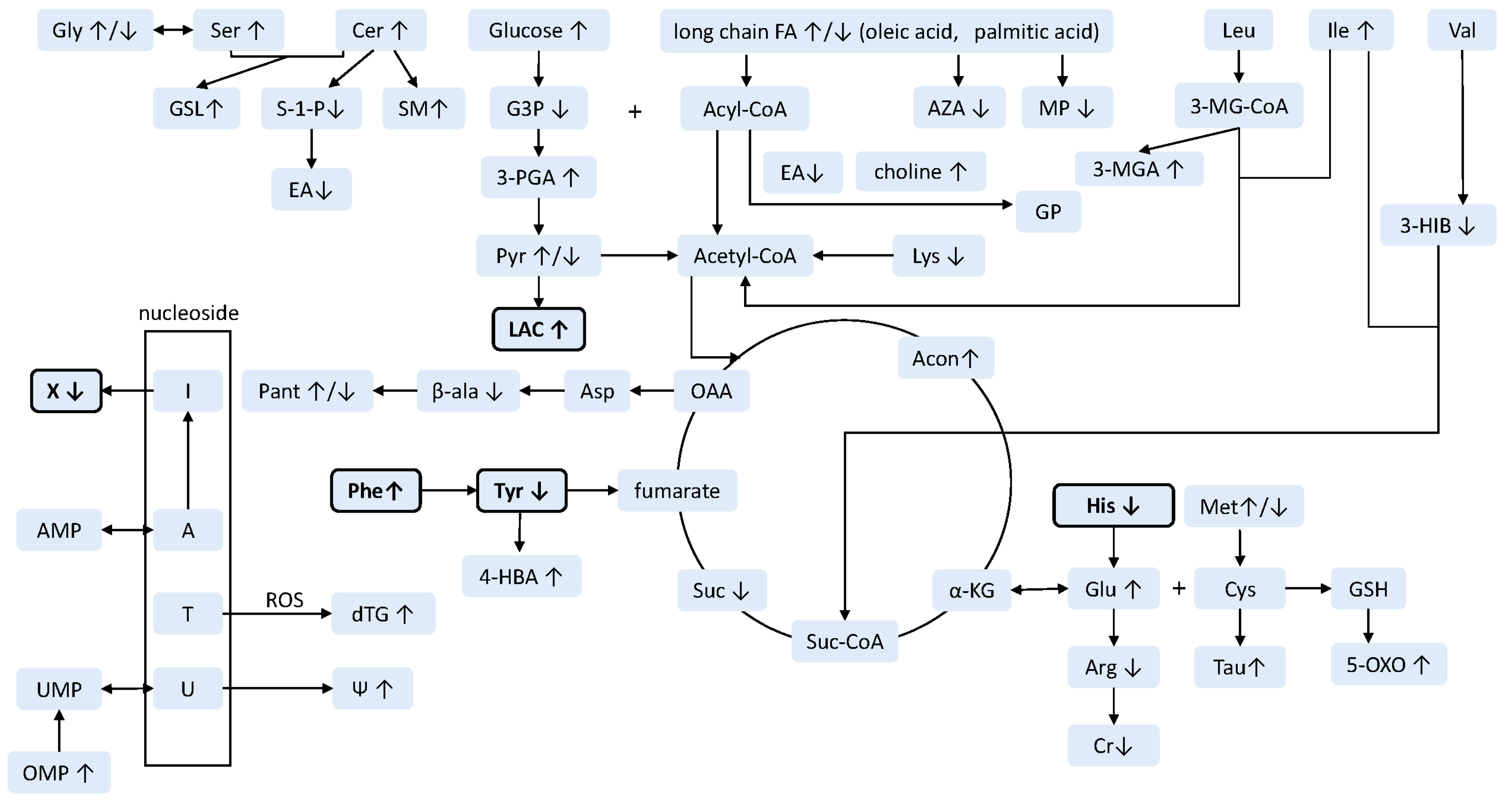 | Lipid | Sphingolipid | serine ↑ [32], ceramides ↑ [37], glycosphingolipids ↑ [37], sphingomyelins ↑ [37], ethanolamine ↓ [40], hydantoin-propionate ↓ [42], sphingosine-1-phosphate ↓ [43] |