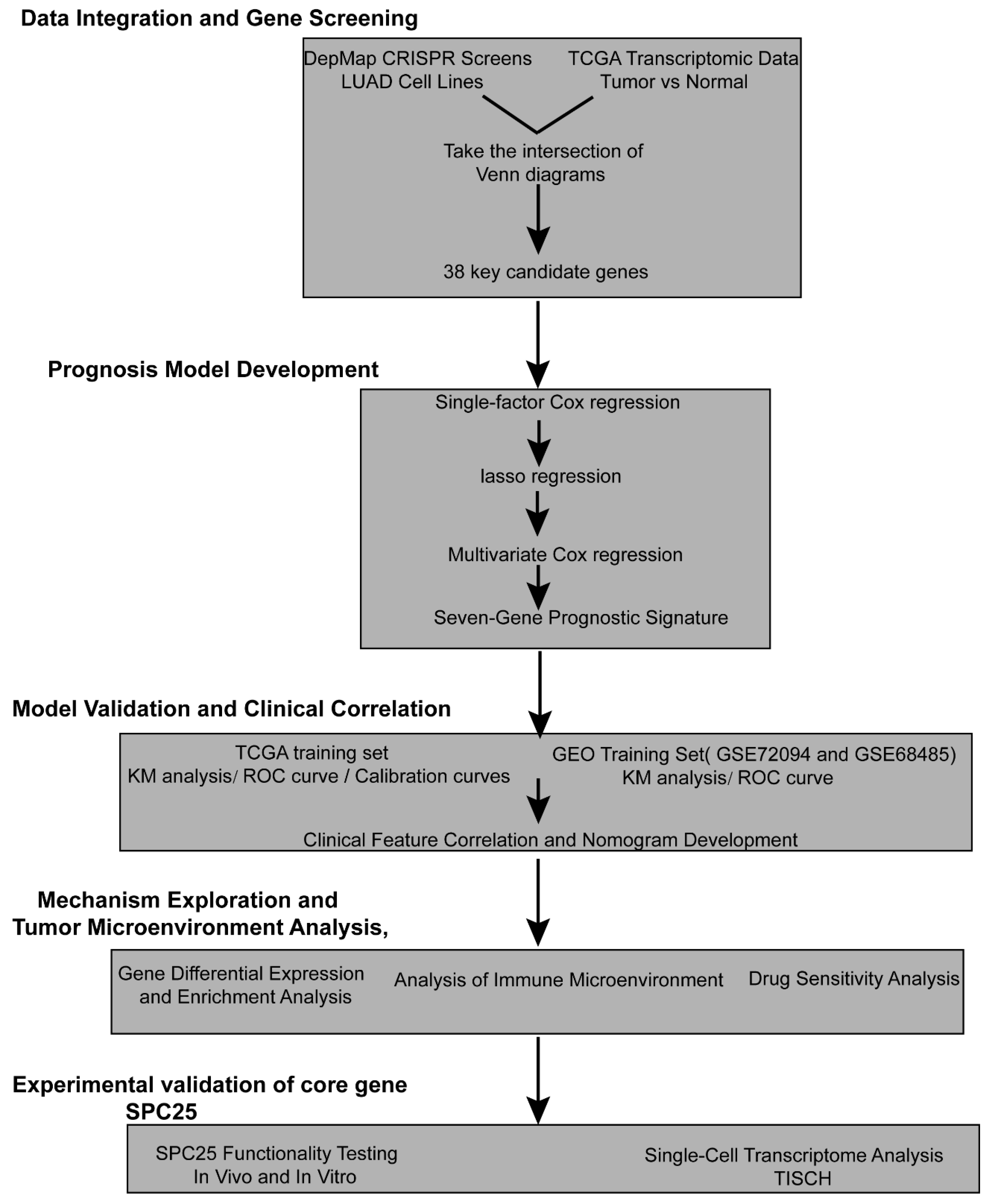 In the present investigation, we leveraged DepMap data to identify genes critical for LUAD proliferation and survival. By integrating these functional dependencies with multi-omics data from patients, we developed and validated a biologically grounded prognostic signature. This model not only enabled robust risk stratification but also revealed an immunosuppressive microenvironment in high-risk patients and predicted differential responses to immunotherapy, chemotherapy, and targeted agents. To experimentally corroborate the clinical relevance of our model, we validated SPC25—a key gene emerging from our signature—and confirmed its oncogenic role. The primary novelty of our work lies in this integrative framework that prioritizes prognostic genes based on functional essentiality. By demonstrating that a model-derived gene like SPC25 possesses significant biological and clinical relevance, we strengthen the credibility of both the target and the modeling approach itself. This study thus provides a reliable prognostic tool and a validated candidate gene, deepening our comprehension of LUAD heterogeneity and offering a tangible resource to aid clinical decision-making for personalized therapy. The overall design of this integrative approach is summarized in Figure 1. We acknowledge that future validation in more diverse cohorts will be essential to enhance the model’s generalizability and clinical utility.