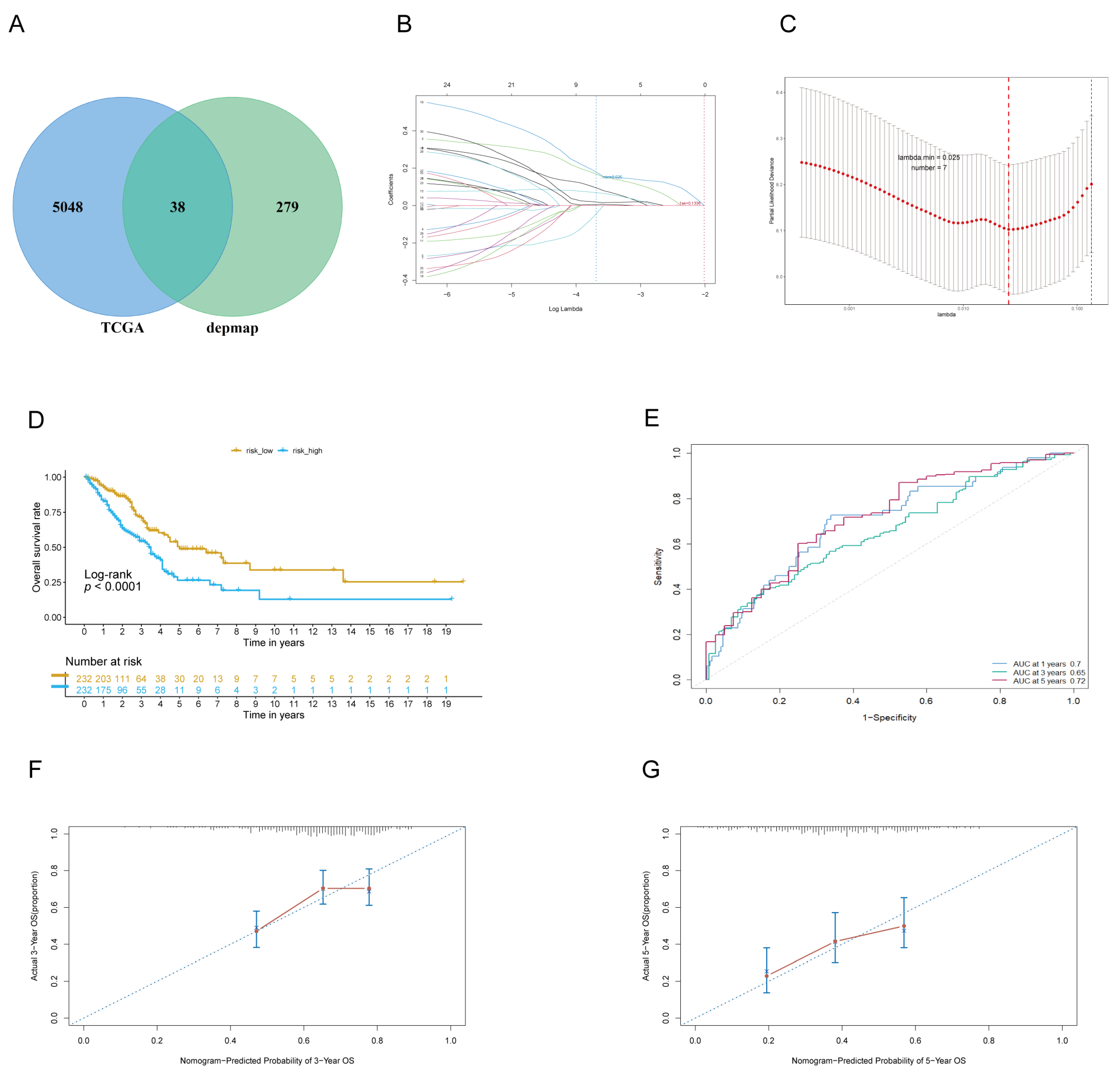 Figure 2. The TCGA cohort established a prognostic risk score model. (A): Venn Diagram obtained by intersecting TCGA and Depmap data. (B,C): Analysis of LASSO coefficient profiles coupled with cross-validation to pinpoint the most influential prognostic genes. (D): KM curves for the TCGA cohort based on different risk scores. (E): Time-dependent ROC curves at one year, three years, and five years in the TCGA dataset. (F,G): Calibration curves for the TCGA cohort prediction model at 3 years (F) and 5 years (G) were constructed separately.