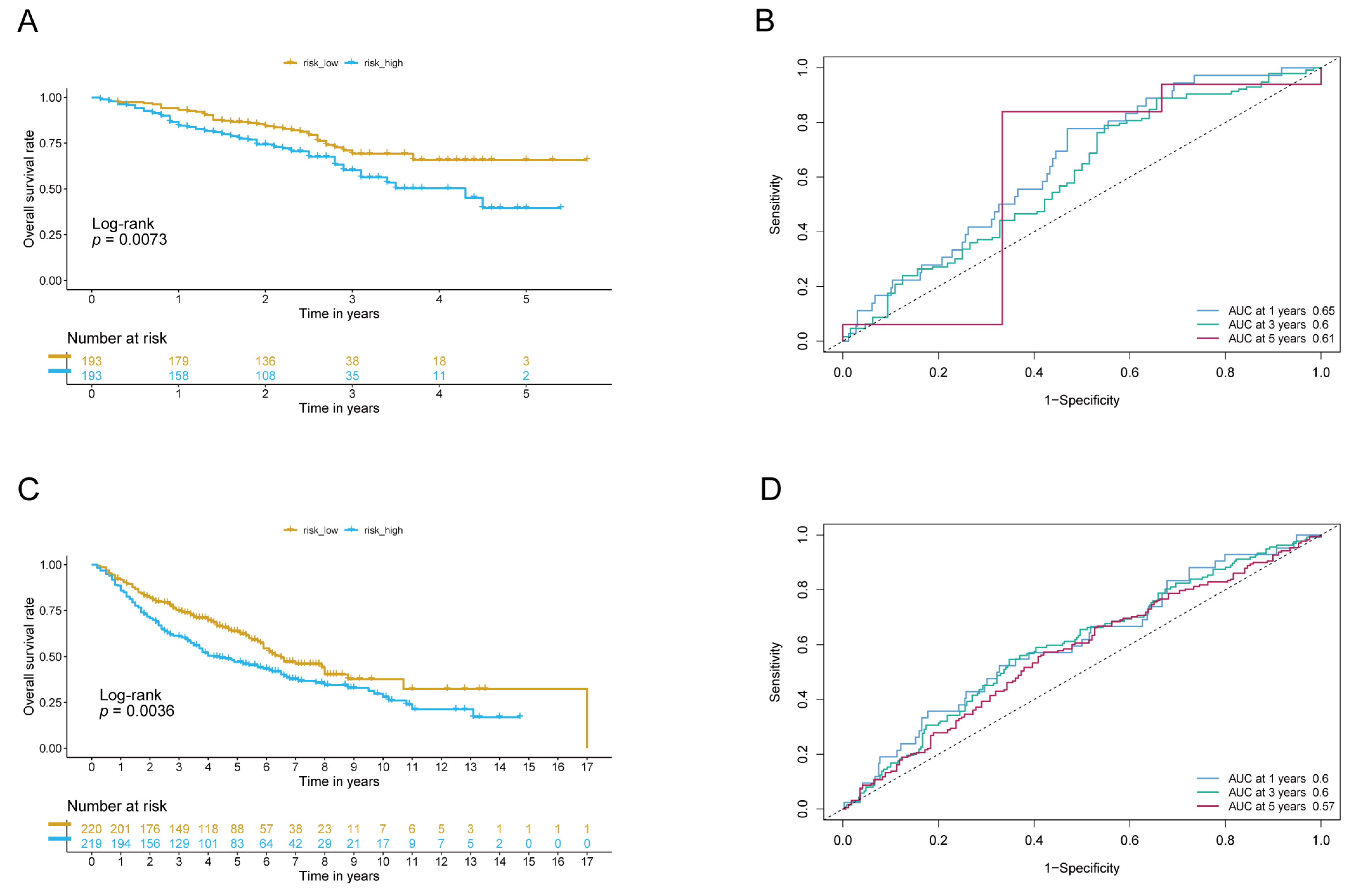 Figure 3. The predictive capacity of the risk score models was evaluated using two independent datasets. (A,B): The KM survival curve (A) and the ROC curve (B) for the first year, third year, and fifth year were generated for the GSE72094 dataset. (C,D): The KM survival curve (C) and the ROC curve (D) for the first year, third year, and fifth year were generated for the GSE68465 dataset.