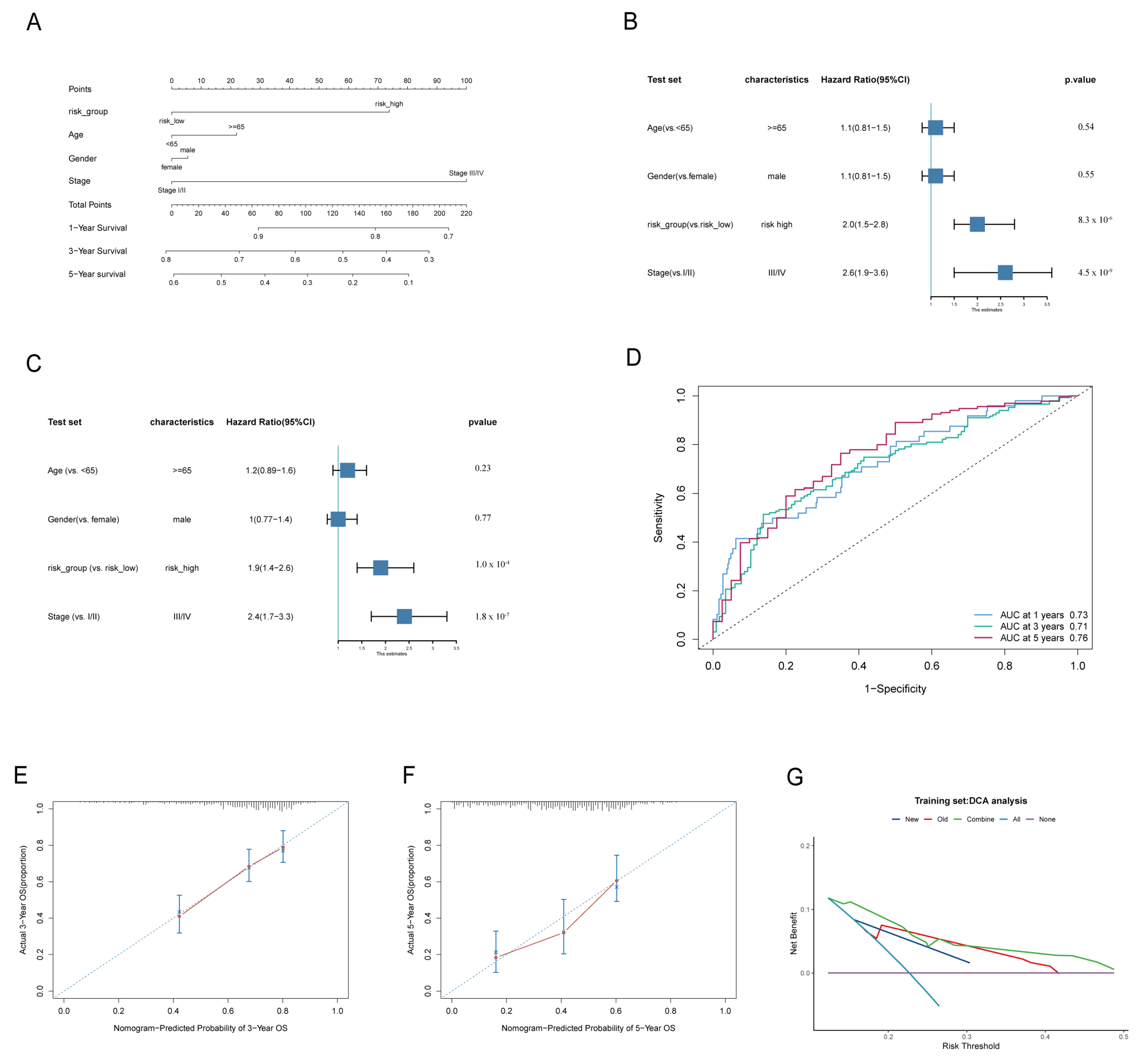 Figure 4. The TCGA cohort constructed a risk score-based nomogram. (A): Nomogram model for prediction of 1-year, 3-year and 5-year OS in the TCGA cohort. (B,C): The univariate (B) and multivariate (C) Cox regression analyses for TCGA cohorts are intuitively represented by forest maps. (D): Time-dependent ROC curves at one year, three years, and five years. (E,F): Calibration curves for the nomogram at 3 years (E) and 5 years (F) were constructed separately. (G) Decision curve analysis (DCA) for the nomogram and individual risk factors.