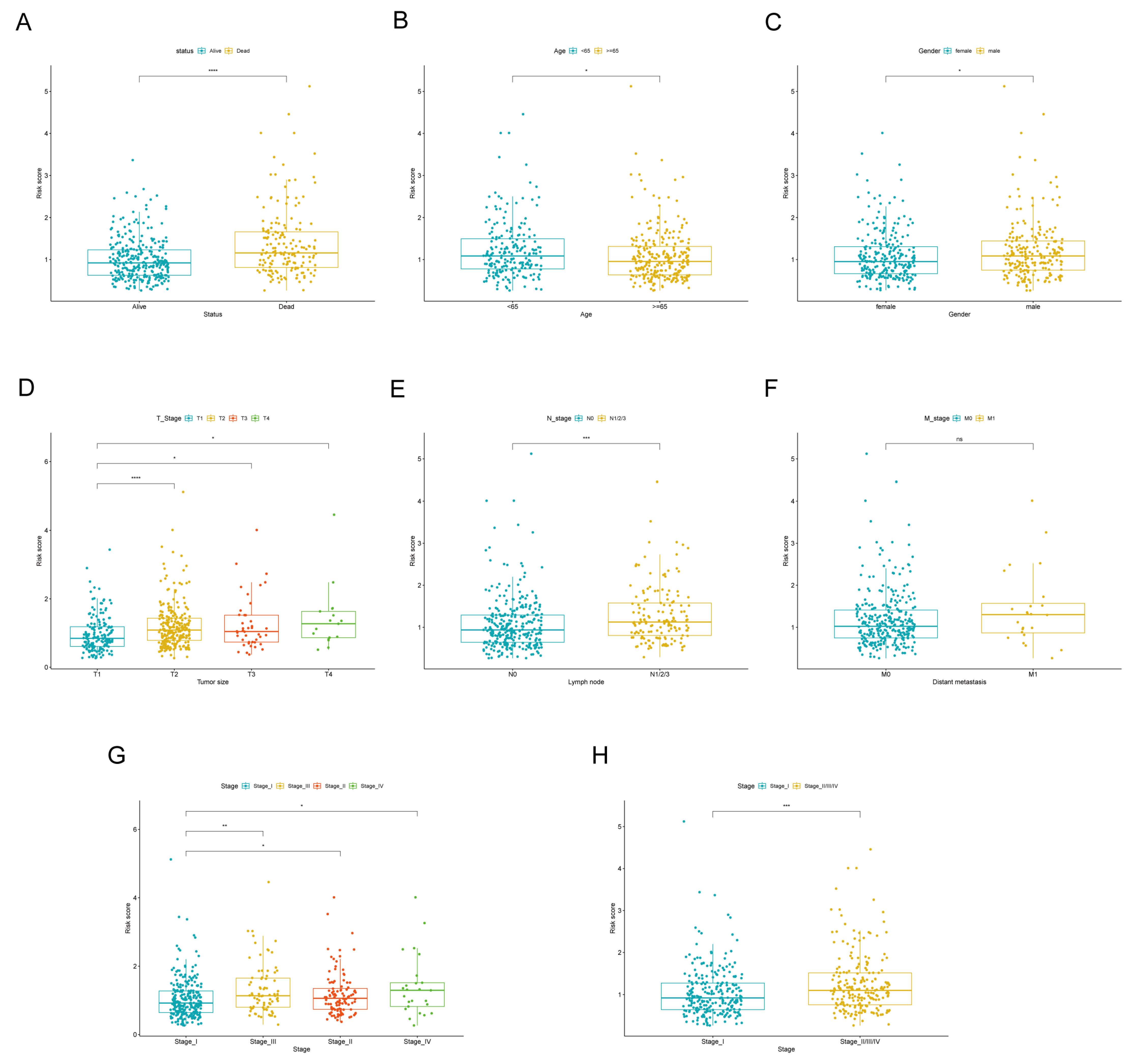Figure 5. Difference in risk scores among subgroups based on clinical characteristics. The Wilcoxon rank-sum test was employed to assess the disparities in risk scores across various patient status (A), age (B), gender (C), tumor size (D), lymph node involvement (E), distant metastasis (F), and pathological stage categories (G,H) within the TCGA cohort.