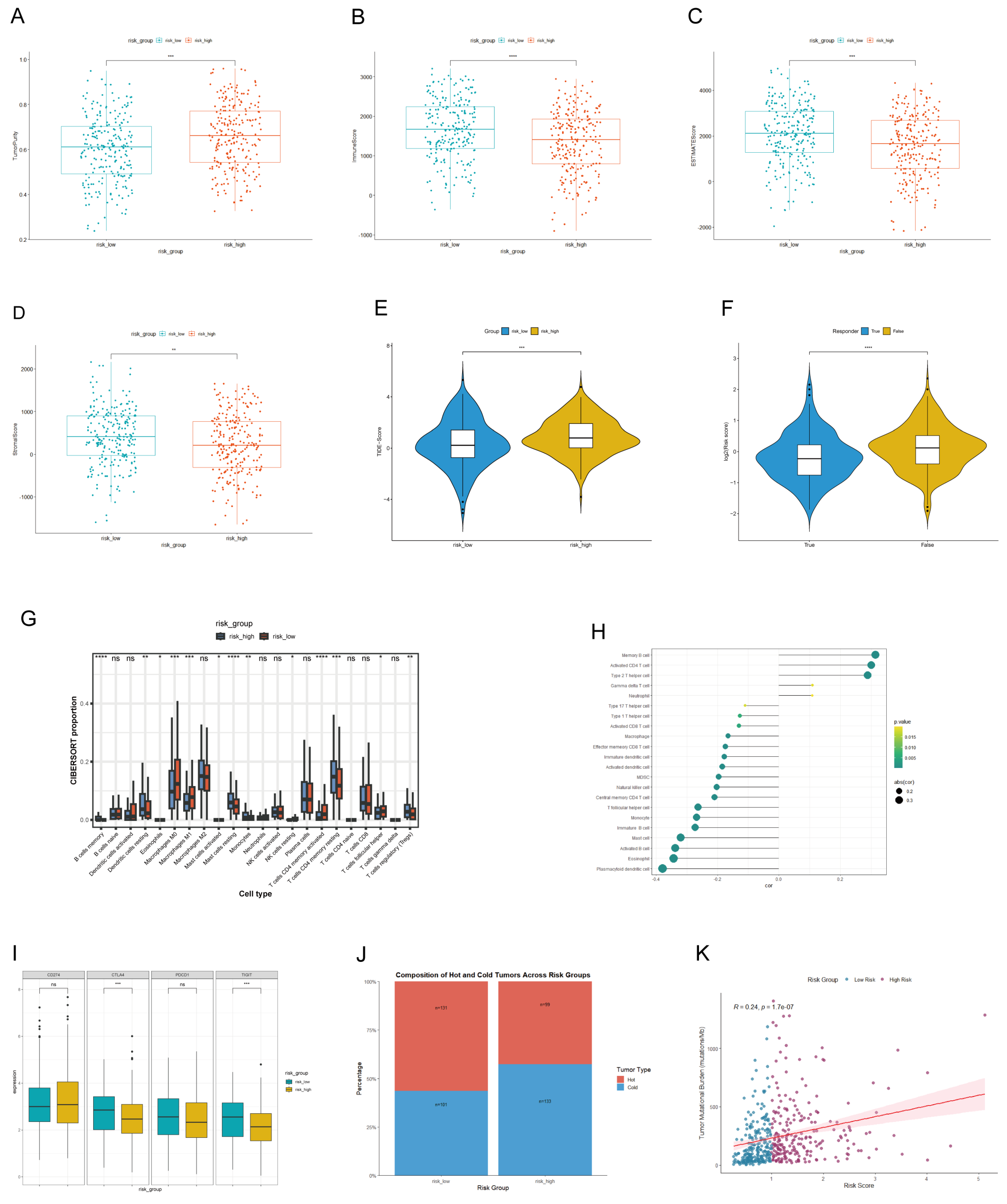 Figure 7. Tumor microenvironment and immunogenomic profiling based on risk score in the TCGA-LUAD cohort. Comparison of (A) tumor purity, (B) immune score, (C) ESTIMATE score, and (D) stromal score between the high-risk and low-risk groups. (E) Immune cell infiltration levels assessed by ssGSEA. (F) Proportional abundances of immune cell types evaluated by CIBERSORT. (G) Comparison of TIDE scores between the high- and low-risk groups. (H) Analysis of immunotherapy responses. (I) Expression differences in key immune checkpoint molecules between the two risk groups. (J) The distribution of “hot” and “cold” tumors across risk groups. (K) Correlation between the risk score and tumor mutation burden (TMB).