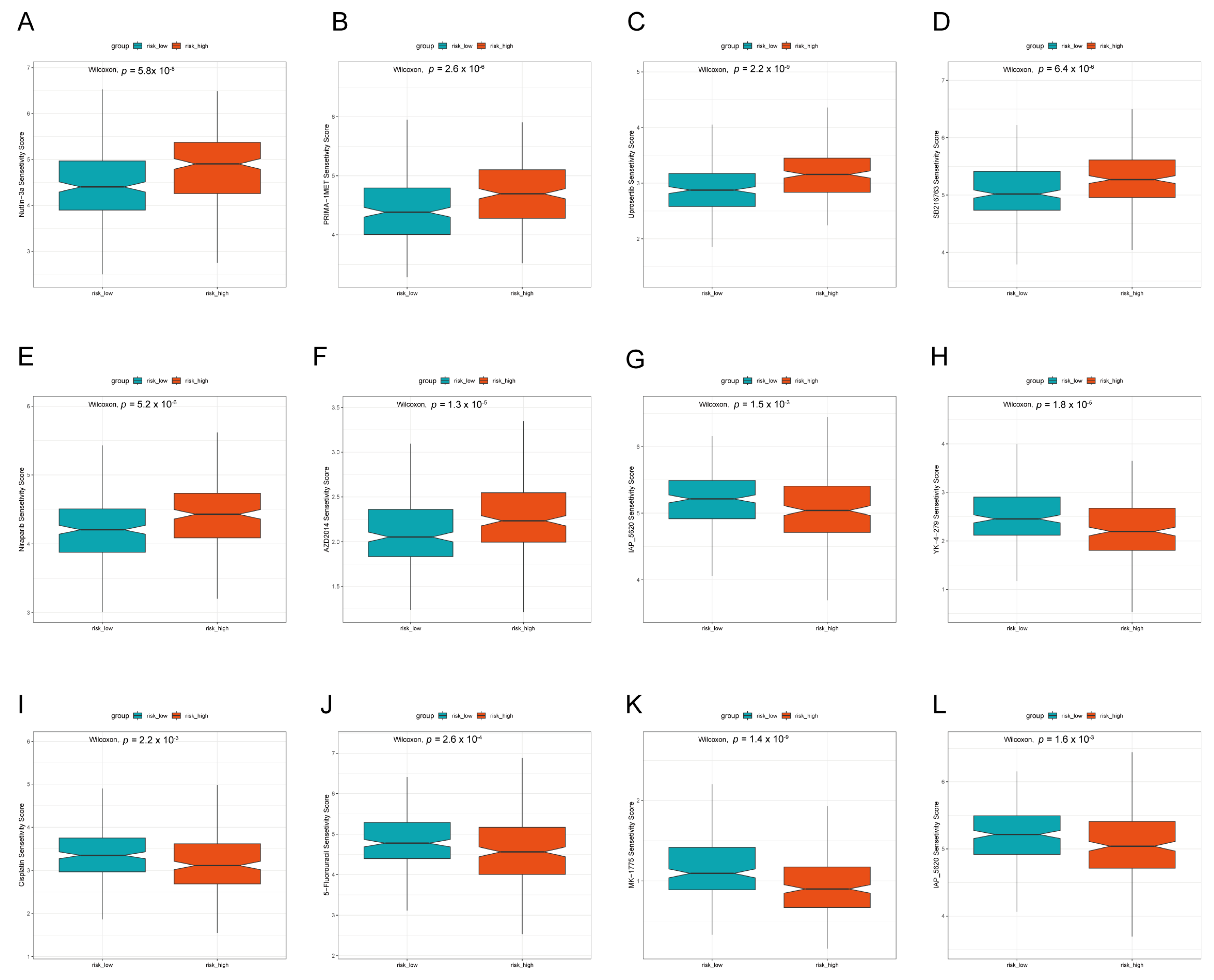 Figure 8. Assessment of drug sensitivity in the TCGA-LUAD cohort in the high- and low-risk groups. Drugs with lower IC50 and p < 0.05 were selected for presentation in the high- (AF) and low-risk groups (GL). (A) Nutlin-3a, (B) PRIMA-1MET, (C) Uprosertib, (D) SB216763, (E) Niraparib, (F) AZD2014, (G) Lapatinib, (H) YK-4-279, (I) Cisplatin, (J) 5-Fluorouracil, (K) MK-1775, (L) IAP_5620.