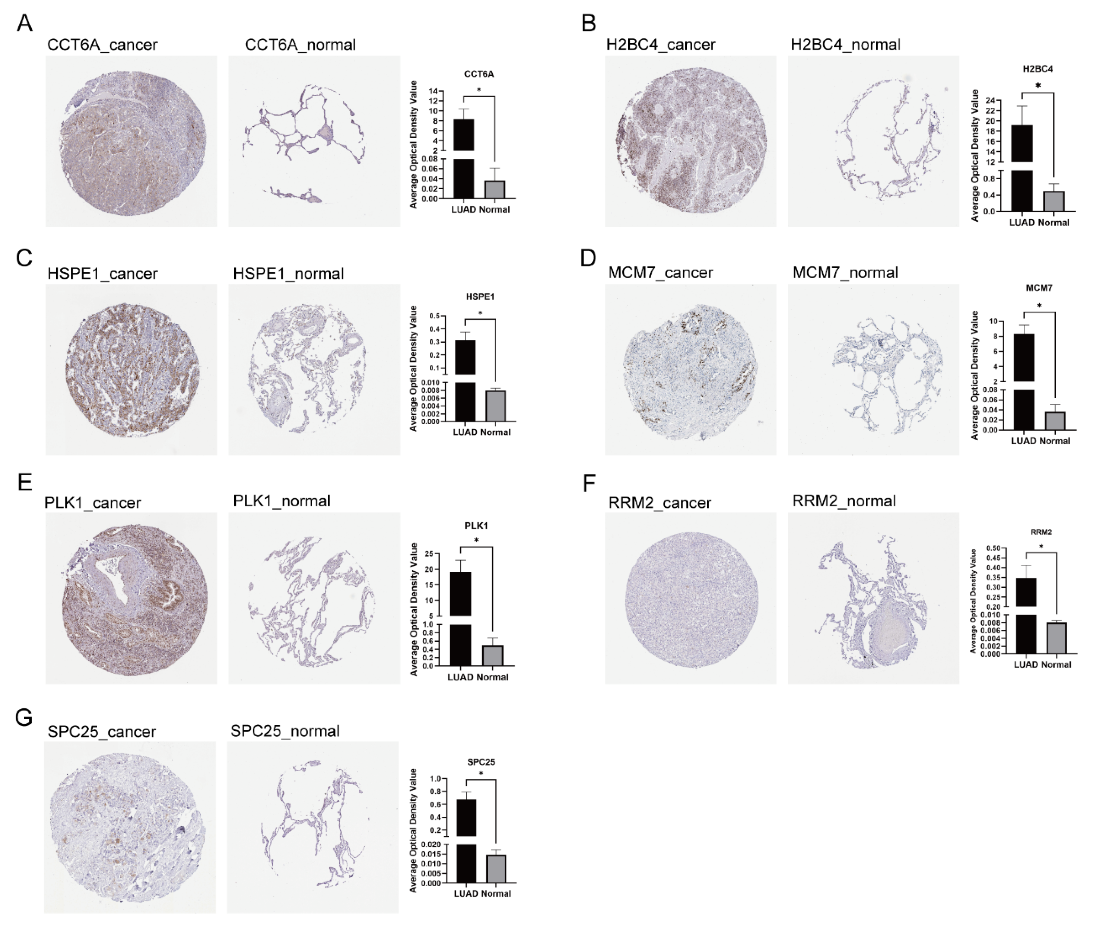 Figure 9. Immunohistochemical results of LADGs in LUAD and normal lung tissues according to the Human Protein Atlas (HPA) database. (A) CCT6A. (B) H2BC4. (C) HSPE1. (D) MCM7. (E) PLK1. (F) RRM2. (G) SPC25.