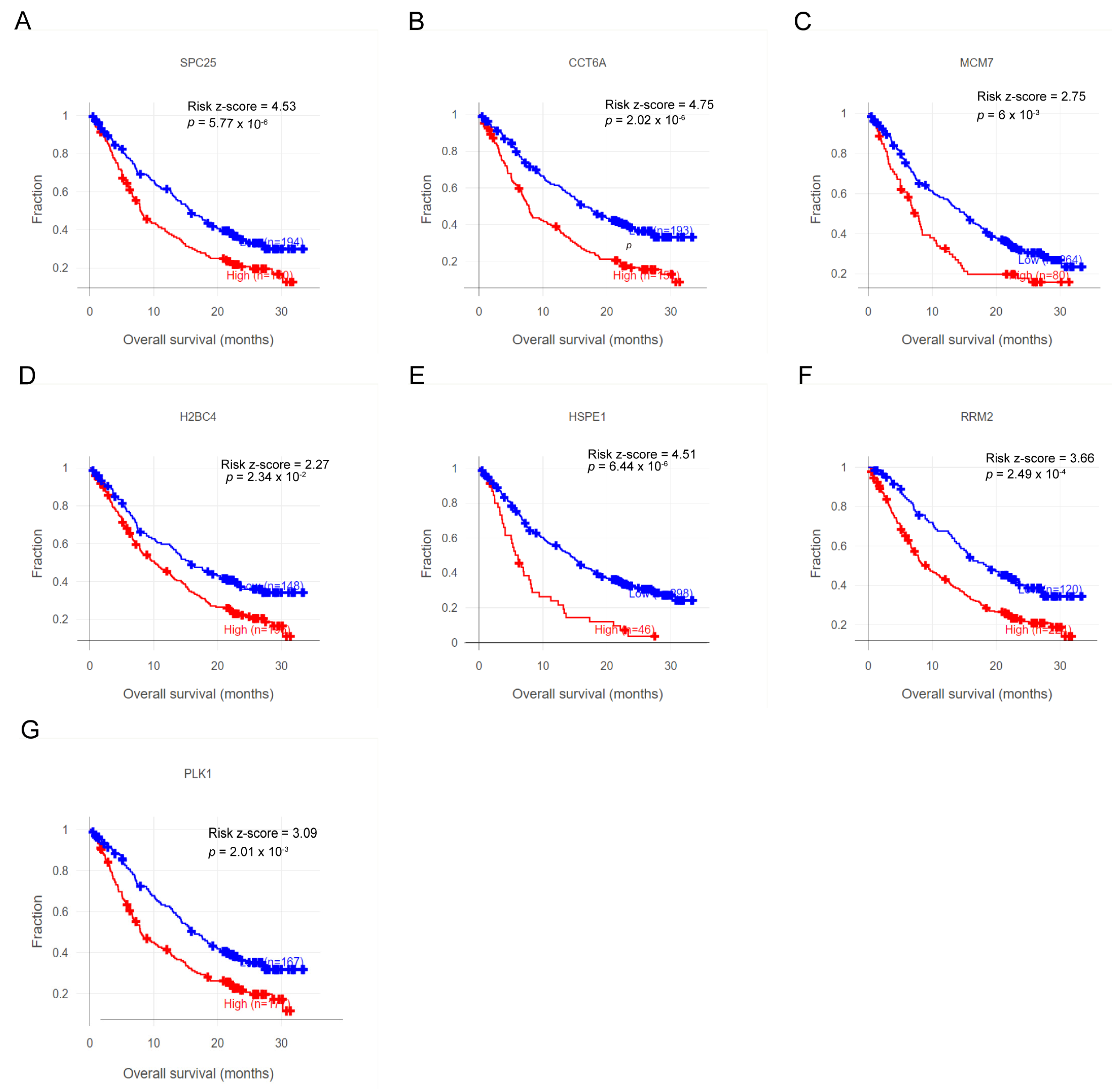 Figure 10. High expression of characteristic genes is associated with poor overall survival in NSCLC patients receiving immunotherapy. (A) SPC25. (B) CCT6A. (C) MCM7. (D) H2BC4. (E) HSPE1. (F) RRM2. (G) PLK1.