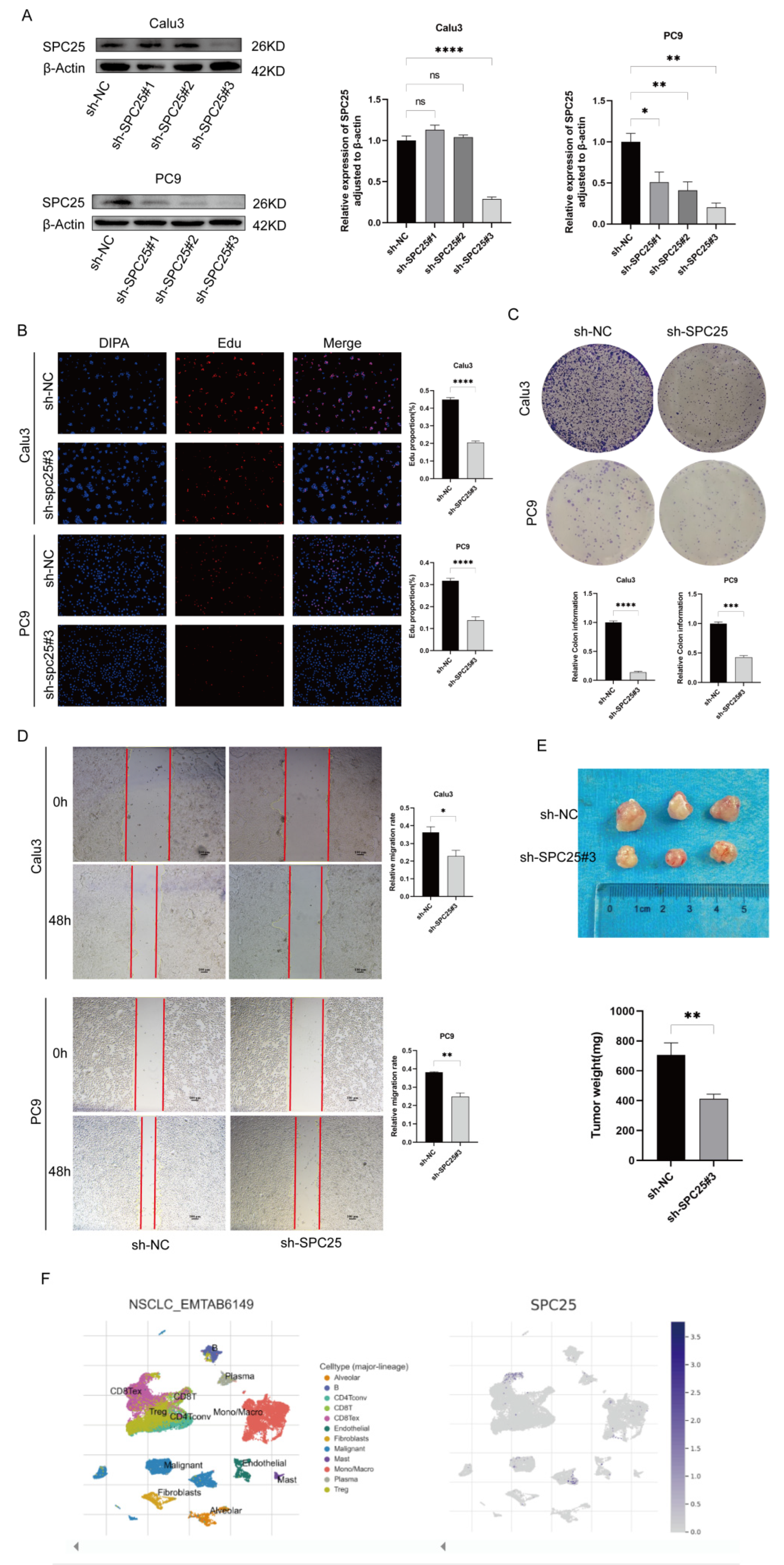 Figure 11. Functional characterization of SPC25 in LUAD. (A) Western Blot analysis confirmed SPC25 knockdown efficiency in Calu3 and PC9 cells. (B) EdU assays were performed to measure cell proliferation in control cells versus SPC25-knockdown cells. (C) Colony formation assays validated the clonogenic ability of Calu3 and PC9 cells following SPC25 knockdown. (D) Wound healing assays demonstrated differences in migration capacity between control and SPC25-knockdown cells. (E) In Vivo tumor formation assay. Representative images of xenograft tumors derived from control and SPC25-knockdown cells and the corresponding tumor weight statistics are shown. (F) Single-cell sequencing analysis.