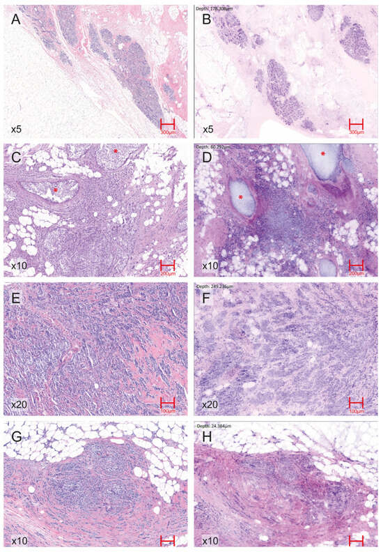 Representative EVFCM–H&E correlation across normal breast tissue and key histopathological breast carcinoma patterns. (A) H&E image (5× magnification) of normal breast parenchyma showing terminal duct–lobular units and interlobular stroma. (B) Corresponding EVFCM image (5× magnification) of normal breast tissue reproducing the lobular architecture and stromal features. (C) H&E section (10× magnification) of IDC with associated ductal carcinoma in situ (DCIS) component, highlighted with red asterisks (*). (D) Corresponding EVFCM image (10× magnification) demonstrating the same in situ foci (*) adjacent to invasive tumour nests. (E) H&E image (20× magnification) of IDC showing infiltrative malignant epithelial clusters with desmoplastic stromal reaction. (F) EVFCM image of the same region (20× magnification), illustrating similar architectural and cytological features, including cohesive tumour nests and stromal changes. (G) H&E section (10× magnification) of invasive lobular carcinoma displaying discohesive small cells arranged in single files and linear cords infiltrating the stroma. (H) Corresponding EVFCM image (10× magnification), identifying the same lobular growth pattern and cell morphology.