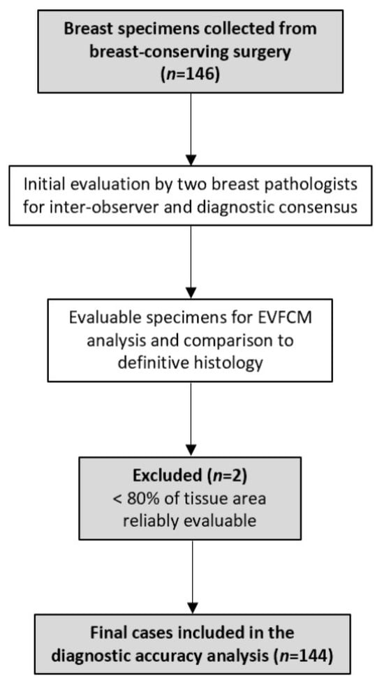 A total of 146 consecutive breast specimens were prospectively collected, of which 144 were evaluable for EVFCM analysis and comparison to definitive histology (Figure 1 and Figure 2). Two samples were excluded because less than 80% of the tissue area was reliably evaluable, and they were therefore excluded from the diagnostic analysis. The overall inclusion and exclusion process is summarised in Figure 3, which follows the STARD guidelines for diagnostic accuracy studies.