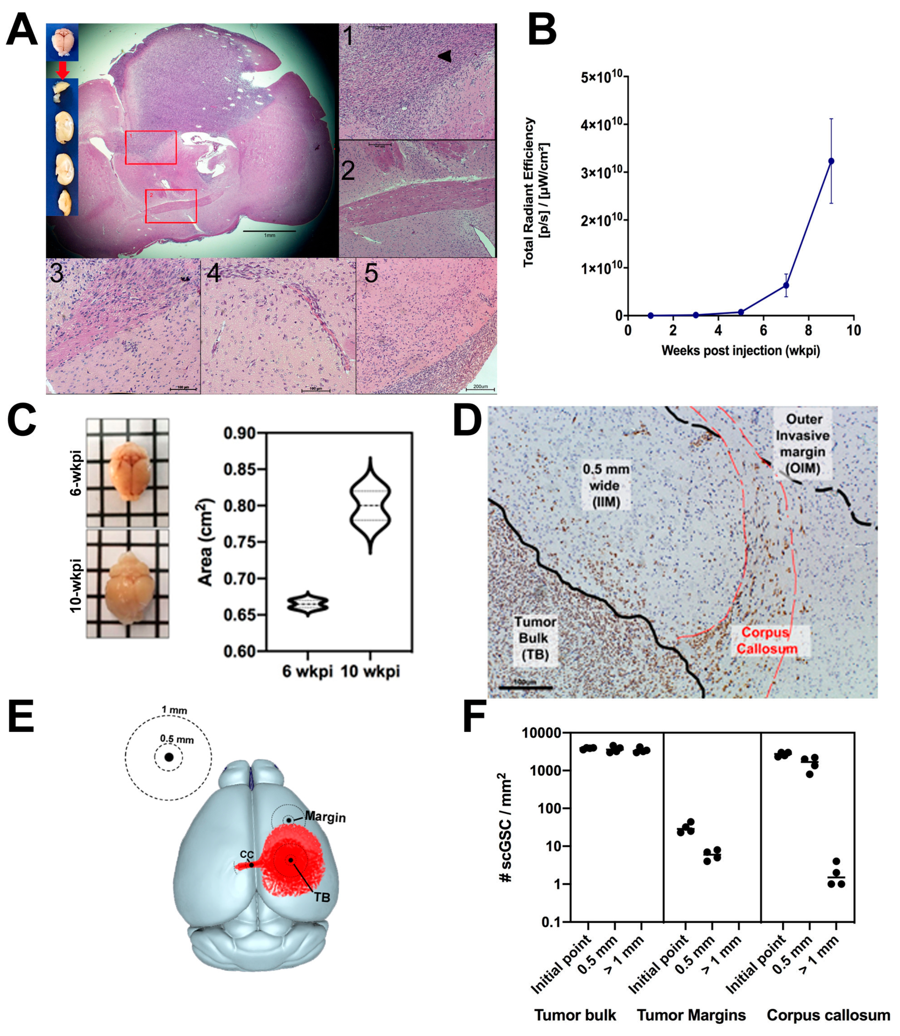 3.1. Establishment and Characterization of an Invasive GBM Mouse Model