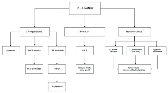 Prolactin is another potential mediator of tumor growth. In a review by Laviv et al., 61% of meningiomas in pregnant patients were diagnosed during the third trimester or immediately postpartum, implicating a possible role of prolactin in tumor dynamics []. Its effects are likely mediated by vascular mechanisms and the presence of prolactin-specific receptors within tumor tissue. Collectively, these endocrine and hemodynamic alterations are illustrated in Figure 2, emphasizing the clinical significance of prolactin-driven tumor growth during late pregnancy and postpartum.
