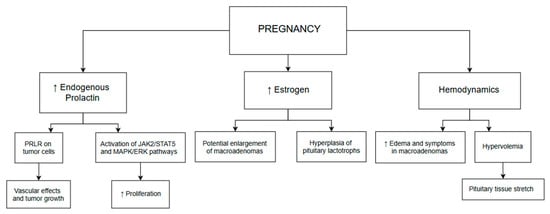 Gliomas and astrocytomas may also increase in size during pregnancy, though hemodynamic changes—such as hypoxemia, hypercapnia, and hypervolemia—appear to play a more dominant role in their progression []. Nevertheless, evidence suggests a possible involvement of prolactin in the pathophysiology of these tumors as well. Prolactin has been shown to activate JAK2/STAT5 and MAPK/ERK signaling cascades Via the PRLR, potentially contributing to the growth of glioblastomas [].