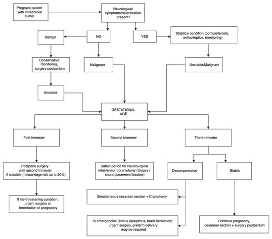 - Zohdy, Y.M.; Agam, M.; Maldonado, J.; Jahangiri, A.; Pradilla, G.; Garzon-Muvdi, T. Symptomatic intracranial tumors in pregnancy: An updated management algorithm. J. Neurosurg. Case Lessons 2023, 5, CASE2399. [Google Scholar] [CrossRef] [PubMed]