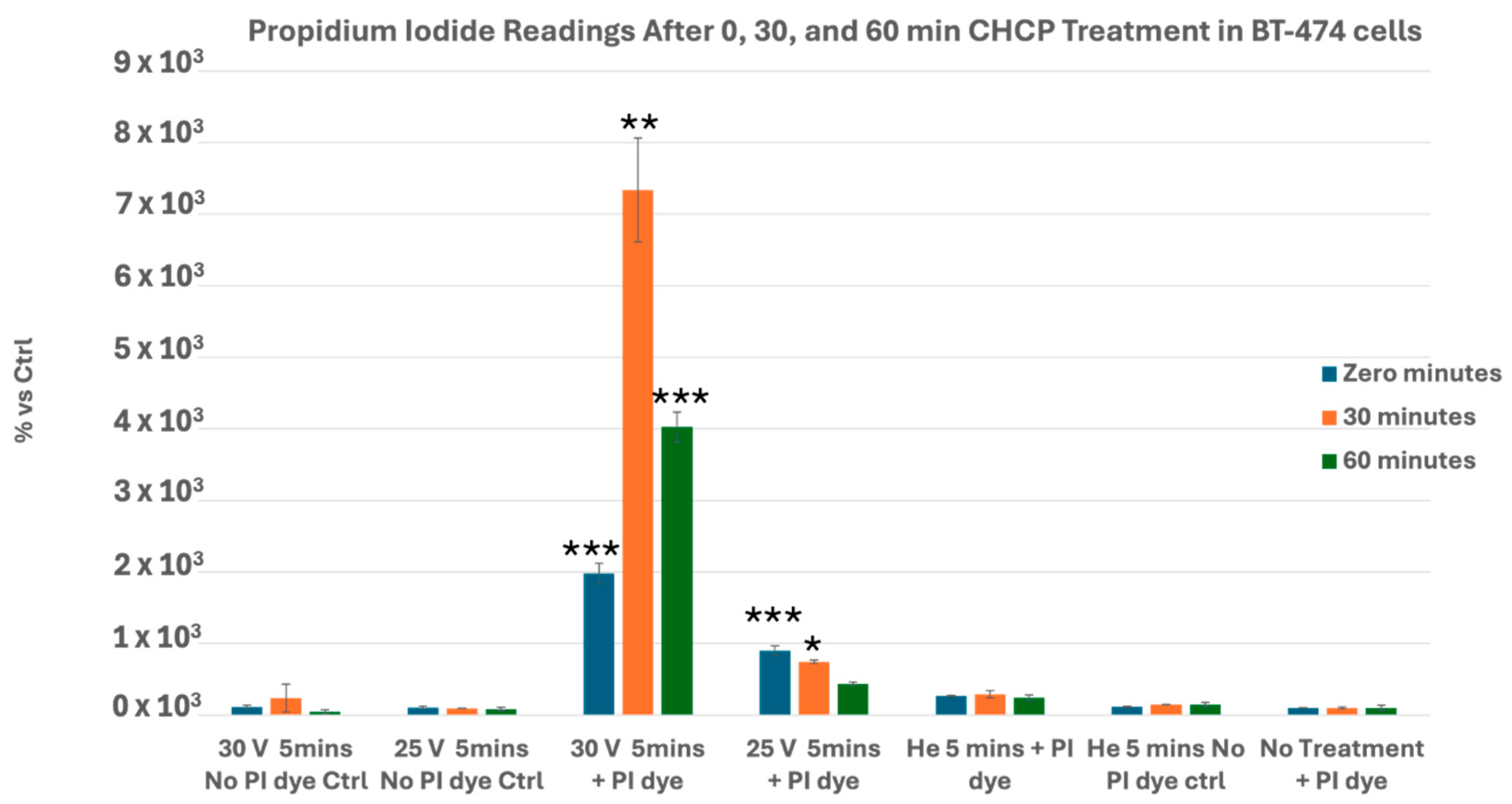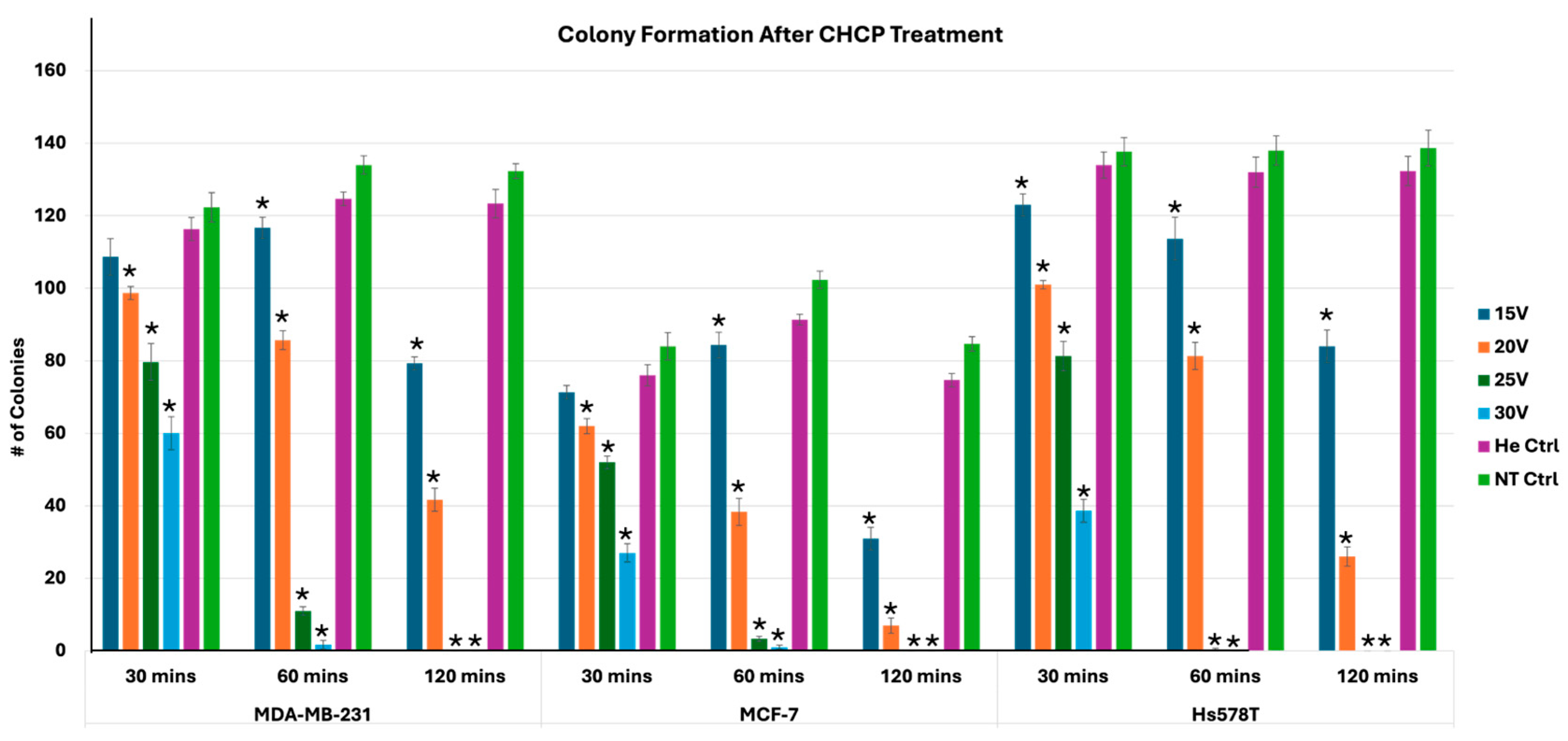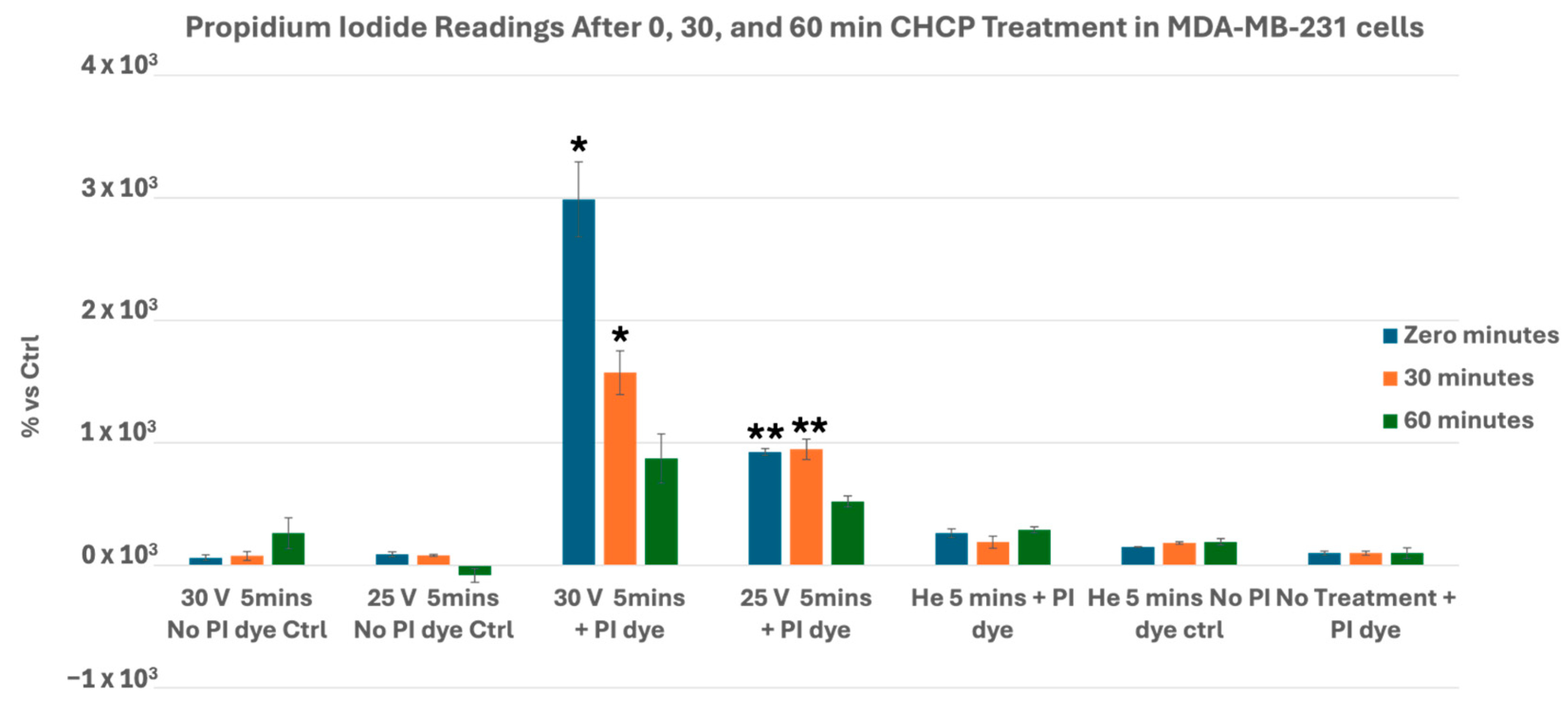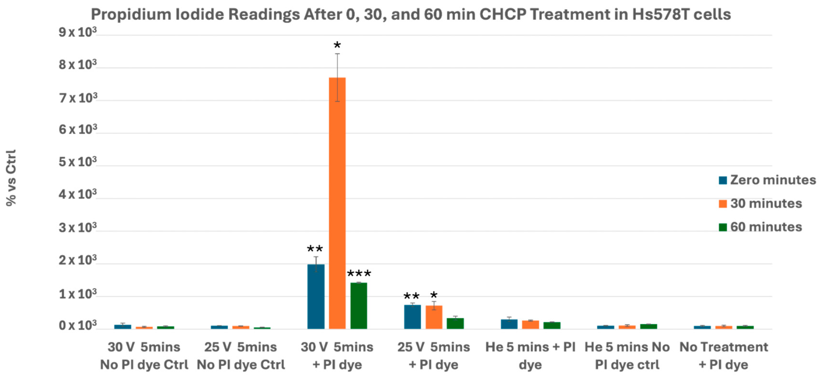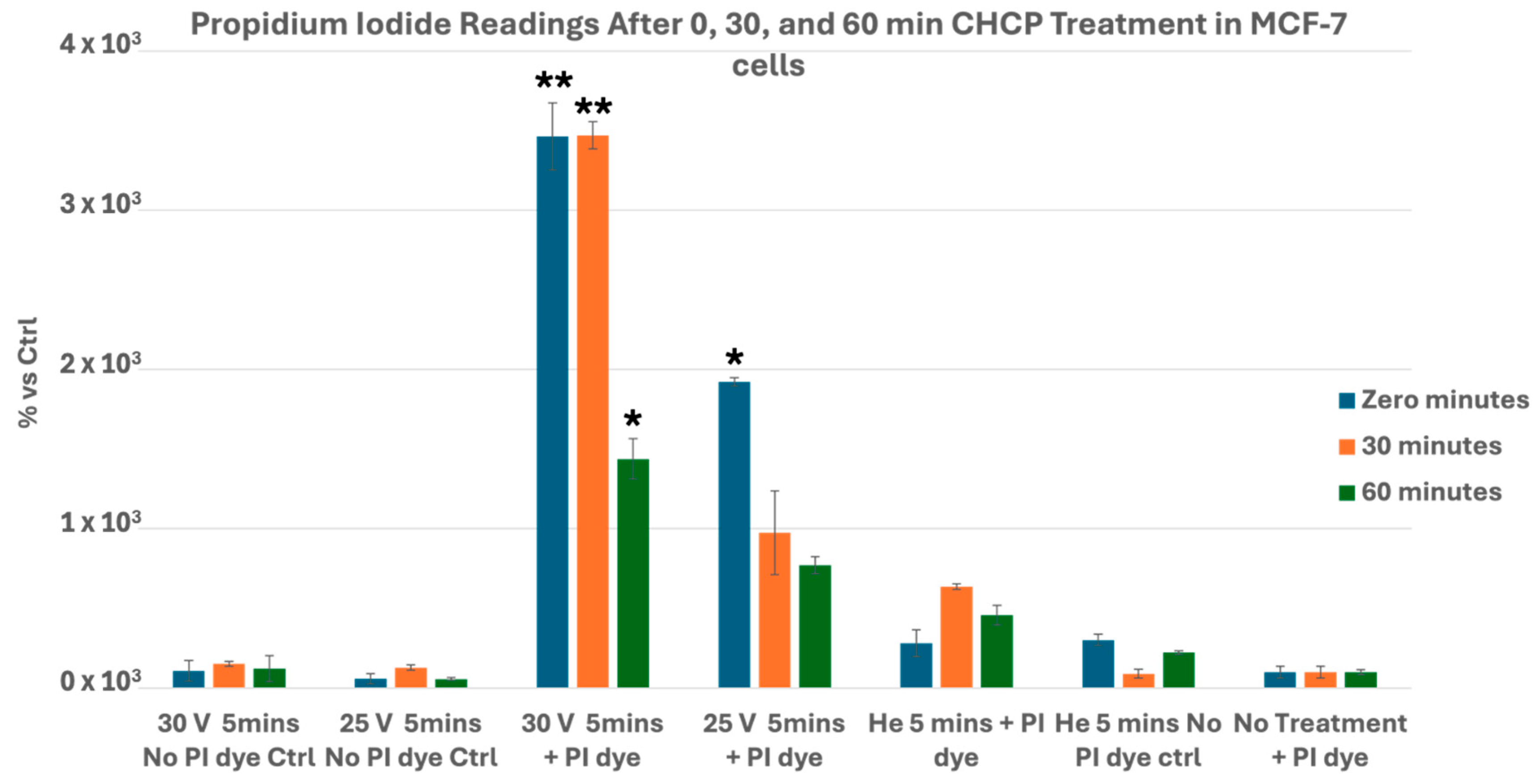 3.1. CHCP Induces Voltage- and Time-Dependent Electroporation in Breast Cancer Cells