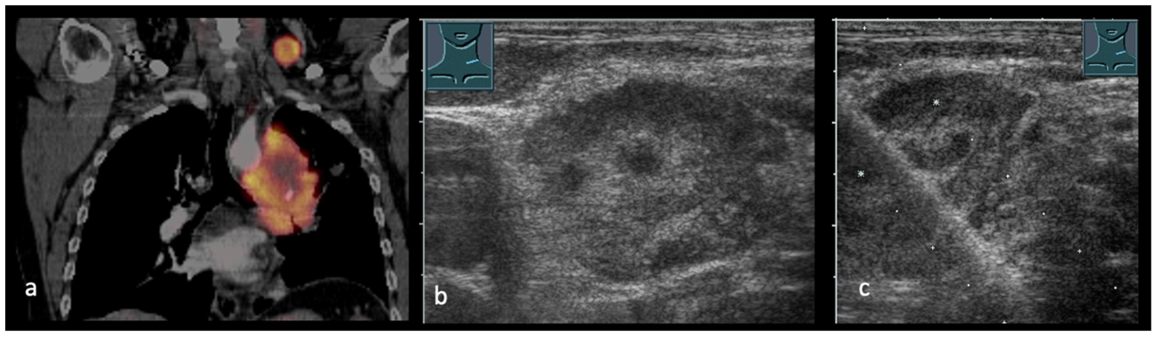 - Prosch, H.; Strasser, G.; Sonka, C.; Oschatz, E.; Mashaal, S.; Mohn-Staudner, A.; Mostbeck, G.H. Cervical ultrasound (US) and US-guided lymph node biopsy as a routine procedure for staging of lung cancer. Ultraschall Med. 2007, 28, 598–603. [Google Scholar] [CrossRef]