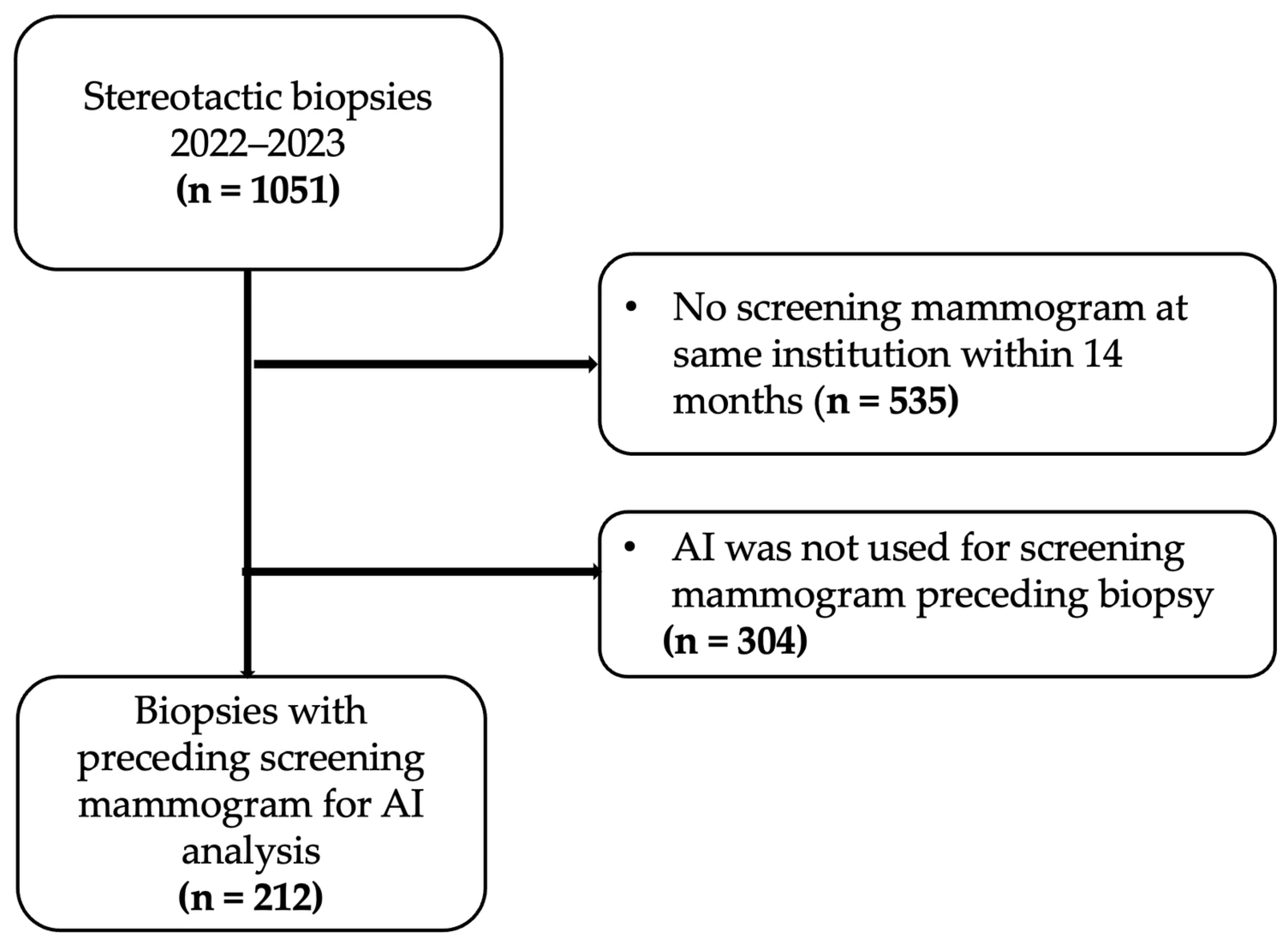 - Chen, I.E.; Joines, M.; Capiro, N.; Dawar, R.; Sears, C.; Sayre, J.; Chalfant, J.; Fischer, C.; Hoyt, A.C.; Hsu, W.; et al. Commercial Artificial Intelligence Versus Radiologists: NPV and Recall Rate in Large Population-Based Digital Mammography and Tomosynthesis Screening Mammography Cohorts. Am. J. Roentgenol. 2025, in press. [Google Scholar] [CrossRef] [PubMed]