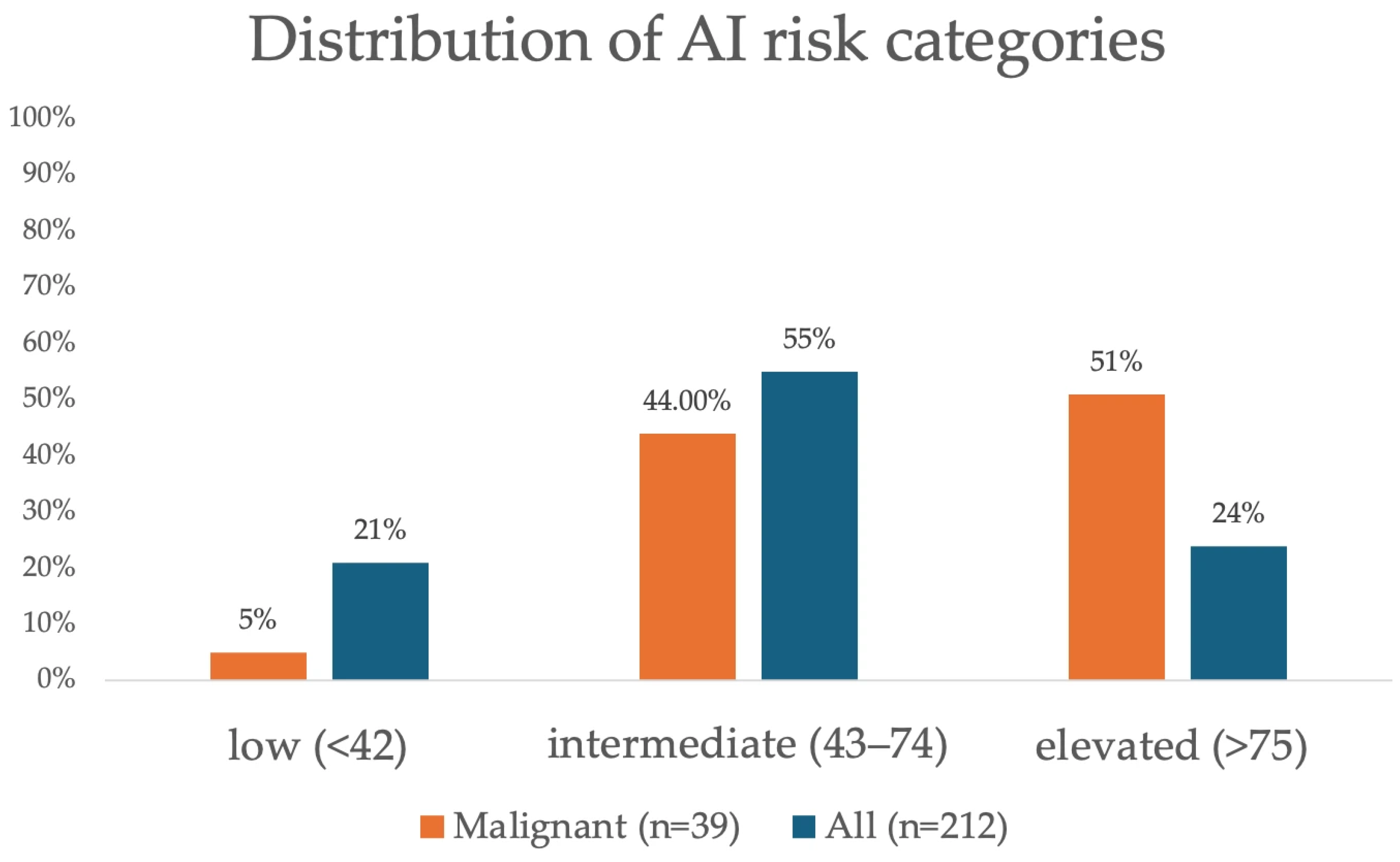 | AI Score | Malignant (n = 39) | Total (n = 211) | % Malignant (PPV) |