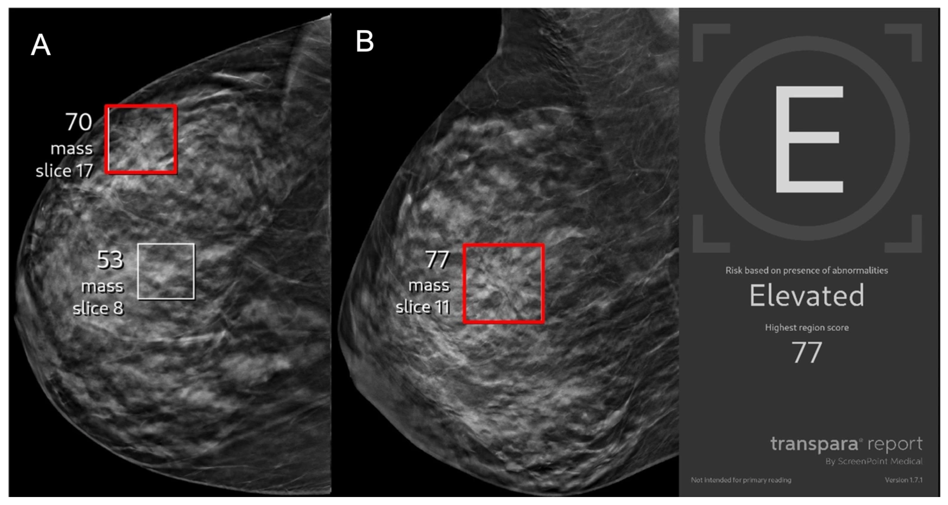 - Letter, H.; Peratikos, M.; Toledano, A.; Hoffmeister, J.; Nishikawa, R.; Conant, E.; Shisler, J.; Maimone, S.; Diaz de Villegas, H. Use of Artificial Intelligence for Digital Breast Tomosynthesis Screening: A Preliminary Real-world Experience. J. Breast Imaging 2023, 5, 258–266. [Google Scholar] [CrossRef]