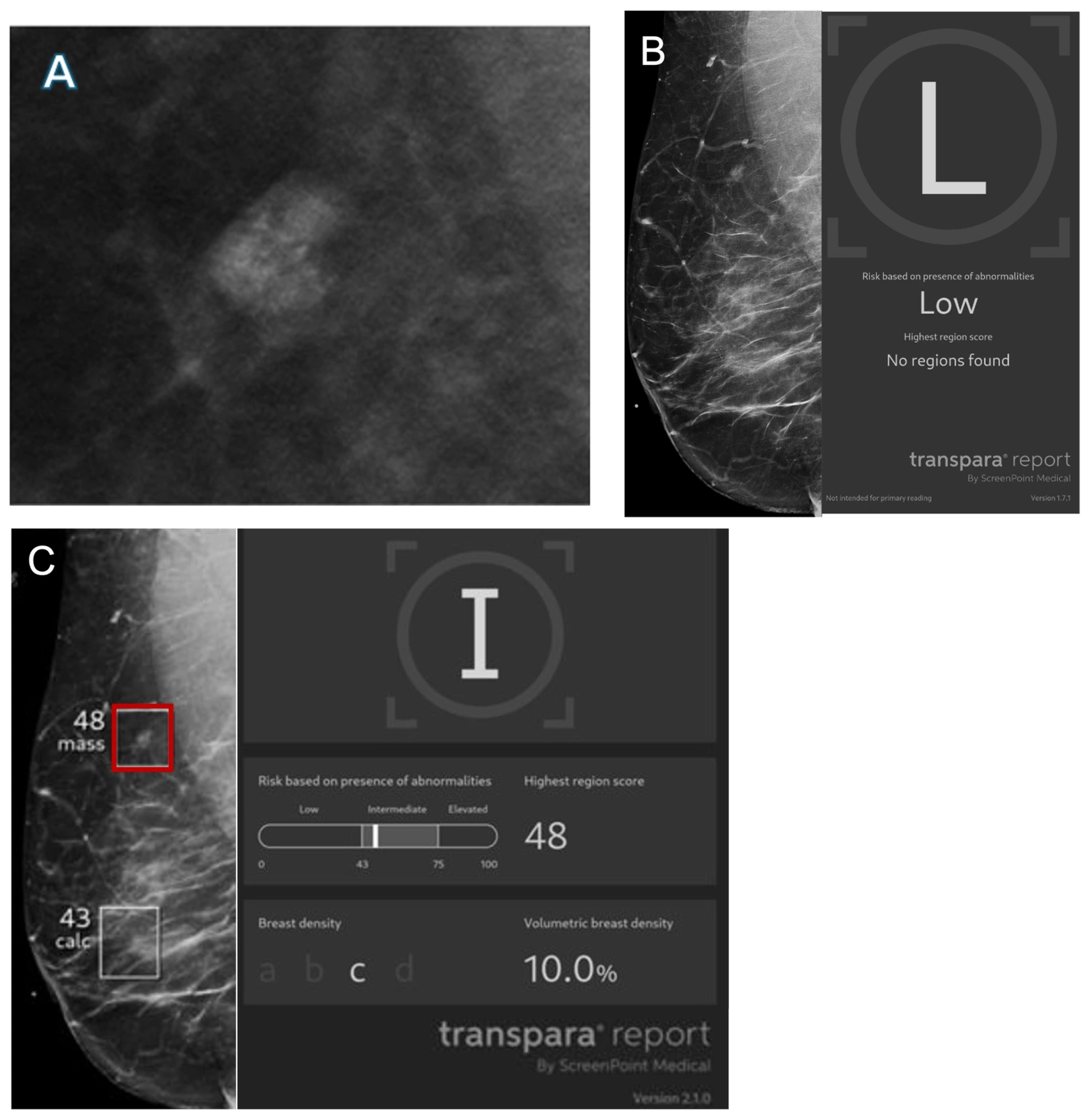 - Koch, H.W.; Bergan, M.B.; Gjesvik, J.; Larsen, M.; Bartsch, H.; Haldorsen, I.H.S.; Hofvind, S. Mammographic features in screening mammograms with high AI scores but a true-negative screening result. Acta Radiol. 2025, 66, 1225–1232. [Google Scholar] [CrossRef] [PubMed]