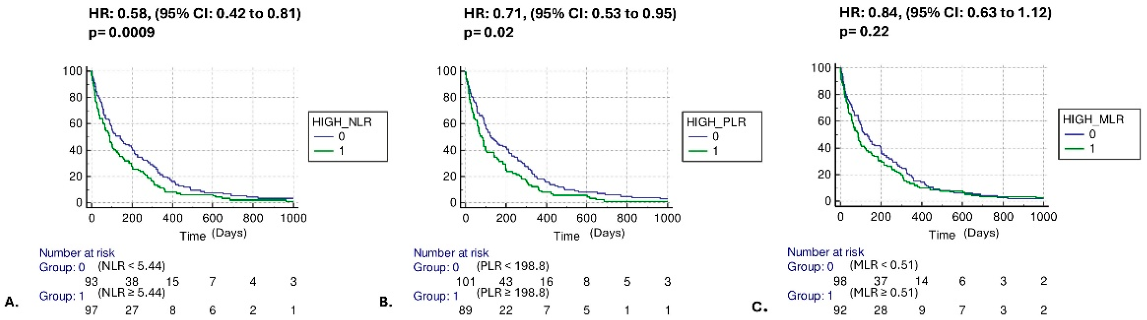 APA StylePapaioannou, O., Fiste, O., Theohari, E., Sampsonas, F., Dimitrakopoulos, F.-I., Koutras, A., Gkiozos, I., Vathiotis, I., Kotteas, E., & Tzouvelekis, A. (2025). The Prognostic Role of Different Blood Cell Count-to-Lymphocyte Ratios in Patients with Lung Cancer at Diagnosis. Cancers, 17(23), 3879. https://doi.org/10.3390/cancers17233879