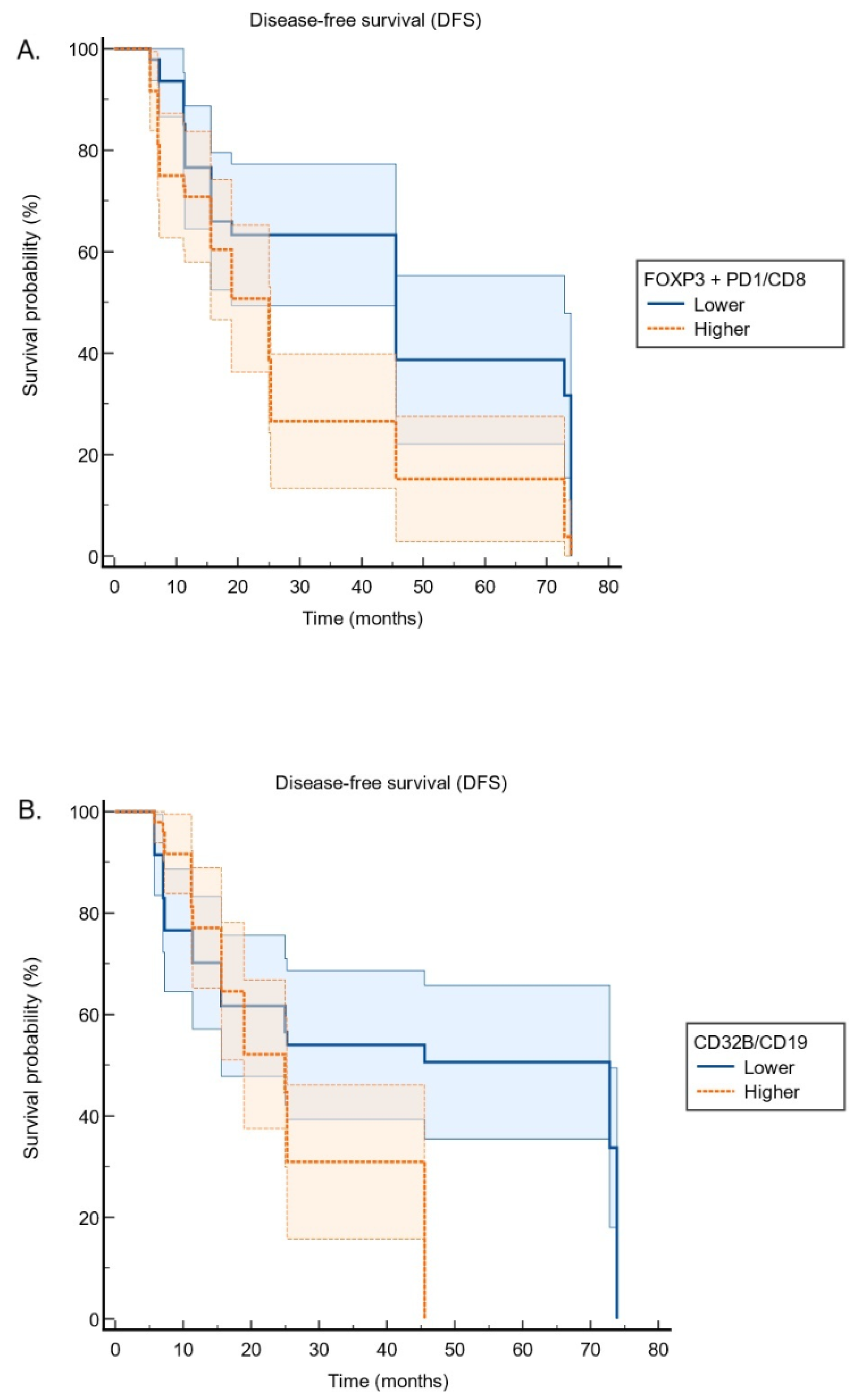 3.2. Clinicopathologic Associations of T- and B-Cell Immunomarker Expression in the Tumor Microenvironment
