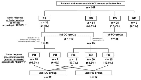 A total of 147 patients with unresectable HCC were enrolled. At the first radiologic evaluation (week 6), the responses were partial response (PR) in 32 patients, stable disease (SD) in 81, progressive disease (PD) in 25, and not evaluable (NE; mainly due to treatment discontinuation or deterioration) in 9. Patients with PR or SD were classified as the 1st-DC group (n = 113) and those with PD as the 1st-PD group (n = 25). Among the 1st-DC group, 109 proceeded to the second evaluation (median 14.8 weeks): 92 achieved disease control (2nd-DC) and 17 progressed (2nd-PD). Four patients were excluded due to short follow-up or missing data.