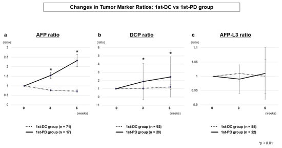 Tumor marker dynamics at the first evaluation (1st-DC vs. 1st-PD) AFP ratio (a), DCP ratio (b), and AFP-L3 ratio (c). AFP and DCP ratios diverged significantly between groups as early as week 3, with clearer separation at week 6. AFP-L3 ratio showed no significant differences.