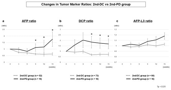 Tumor marker dynamics at second evaluation (2nd-DC vs. 2nd-PD) AFP ratio (a), DCP ratio (b), and AFP-L3 ratio (c). AFP and DCP ratios diverged significantly from week 9 onward, whereas AFP-L3 ratio showed no significant differences.