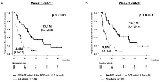 At the week 3 landmark, ROC analysis identified an AFP ratio ≥1.4 or a DCP ratio ≥ 1.0 as practical thresholds for predicting 1st-PD, with a high sensitivity (0.93) and a negative predictive value (0.97) (Table S1). In the landmark PFS analysis starting at week 3, patients meeting either cutoff showed significantly shorter PFS compared with those below both thresholds (median PFS from the week 3 landmark: 3.4 vs. 13.1 months; p < 0.001) (Figure 4a). For the week 9 landmark analysis in the 1st-DC cohort, an AFP ratio ≥ 1.1 or a DCP ratio ≥ 1.5 provided the best discrimination for predicting 2nd-PD, again with a high sensitivity (0.93) and a negative predictive value (0.97) (Table S2). Patients above either cutoff experienced markedly shorter PFS than those below both thresholds (median PFS from the week 9 landmark: 3.8 vs. 14.0 months; p < 0.001) (Figure 4b).