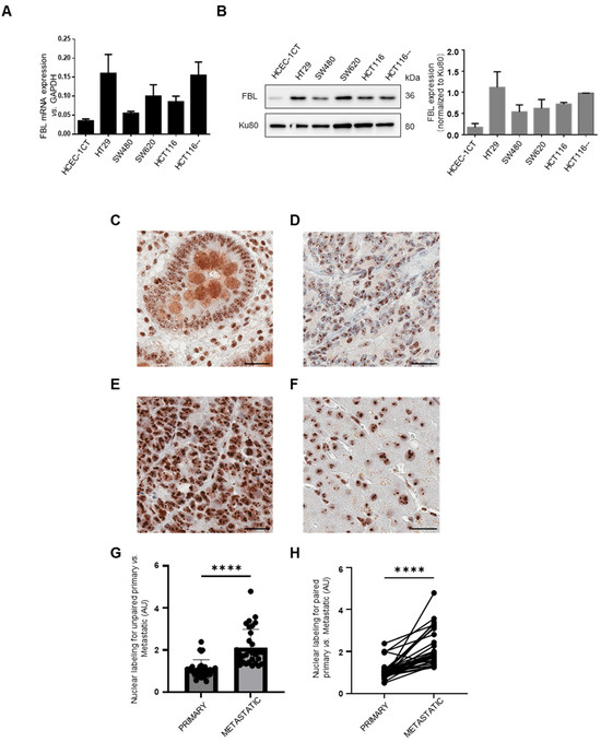 We investigated FBL expression in CRC cell lines and normal colonic epithelial cells (HCEC-1CT) using RT-qPCR and Western blotting. FBL was significantly upregulated in all CRC adenocarcinoma cell lines compared to HCEC-1CT (Figure 1A,B). To examine tissue expression, we performed IHC on metastatic CRC patient biopsies. Paired primary and metastatic tumors were analyzed in 28 out of 30 cases. FBL was detected in all 30 primary and metastatic tumors, with strong or moderate signals. FBL immunostaining was examined across normal and cancerous colorectal tissues. In adjacent normal colonic tissue (C), FBL expression was restricted to the nucleolar compartment of both epithelial and stromal cells, with moderate intensity observed in glandular epithelial cells. In primary CRC samples (D), FBL staining was consistently strong, showing pronounced nucleolar labeling in all tumor cells. Metastatic CRC sections (E) displayed a significantly higher FBL signal intensity, accompanied by enlarged nucleoli compared to matched primary tumors from the same patients. In normal liver tissue adjacent to metastases (F), hepatocytes showed only low to moderate nucleolar FBL staining, similar to that seen in normal colon tissue.