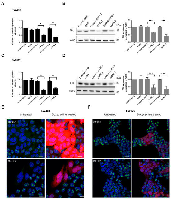 To investigate the role of FBL, we used SW-480 and SW-620 cells as an isogenic model for cancer progression and metastasis. Two short hairpin (sh) RNAs delivered by lentiviral vectors with an RFP reporter were used to stably silence FBL expression, while a non-targeting shNS sequence served as a control. All sequences were doxycycline-inducible. In shNS cell lines, doxycycline had no effect on FBL expression (Figure 2A–D). However, in shFBL1 (−40%) and shFBL2 (−60%) cells, doxycycline significantly reduced FBL mRNA and protein levels (Figure 2A–D). RFP-positive cells showed a marked decrease in nucleolar FBL upon doxycycline treatment (Figure 2E,F).
