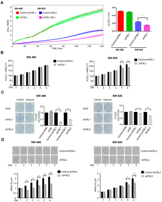 FBL inhibition had differential effects on CRC cell growth depending on cell line and assay format. RTCA revealed no change in growth of SW-480 cells, while a significant reduction was observed in SW-620 cells following doxycycline-induced FBL knockdown (Figure 3A). These findings were consistent with MTS assays, which showed sustained growth inhibition in SW-620 cells only of up to 40% (Figure 3B). To assess long-term clonogenic potential, we conducted colony formation assays. Interestingly, FBL inhibition reduced colony numbers in both SW-480 and SW-620 cells, indicating that FBL contributes to cellular fitness over prolonged periods, even in cells that showed minimal effects in short-term proliferation assays (Figure 3C). This unexpected result suggests that the role of FBL in supporting tumor cell growth may be more pronounced under conditions involving prolonged cell–matrix interactions. To further investigate whether this discrepancy could be influenced by microenvironmental context, we used a 3D spheroid model to assess cell-to-cell interactions. In contrast to the limited effect observed in 2D short-term growth assays, FBL silencing led to a marked reduction in spheroid size and compaction in both SW-480 and SW-620 cells (Figure 3D). These results indicate that FBL supports CRC cell growth in both 2D and 3D contexts, with greater effects observed in environments that mimic in vivo architecture.