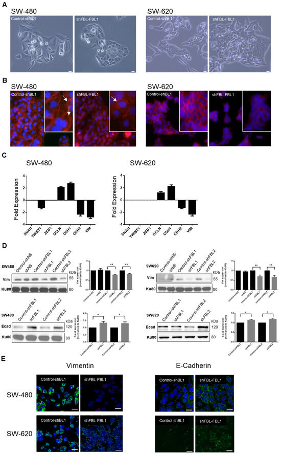 SW-480 cells, derived from a primary adenocarcinoma, exhibit an epithelial-like morphology, while SW-620 cells, from a lymph node metastasis, show a mesenchymal-like phenotype. Phase contrast microscopy revealed that four days of FBL inhibition made SW-480 cells more compact with fewer pseudopodia, while SW-620 cells became less individualized and more aggregated (Figure 4A). F-actin staining showed a shift from a polarized to a uniform distribution at cell junctions upon FBL inhibition, indicating a transition from a migratory to an adherent phenotype (Figure 4B). To further explore these changes, RT-qPCR of EMT-related genes showed significant downregulation of TWIST1, CDH2, and VIM in shFBL cells, while CDH1 and OCLN were upregulated (Figure 4C). ZEB1 and SNAI1 remained unchanged. Western blot analysis revealed that upon FBL inhibition, E-Cadherin increased, and Vimentin decreased in both cell lines, whereas doxycycline treatment alone had no effect (Figure 4D). Immunofluorescence confirmed these results, showing reduced Vimentin and increased E-Cadherin in both cell lines following FBL inhibition (Figure 4E). These findings suggest that FBL suppression shifts SW-480 and SW-620 cells toward a more epithelial phenotype.