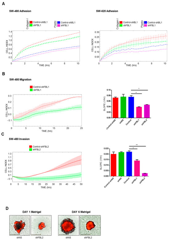 The observed changes in cell shape, cytoskeleton, and EMT-related factors suggested alterations in adhesion, migration, and invasion. We assessed adhesion by measuring electrical impedance using the RTCA system. FBL inhibition reduced SW-480 cell adhesion on both collagen I and plastic surfaces (Figure 5A, left). SW-620 cells exhibited weaker adhesion (SW-480, 1.3 vs. SW-620, 0.25 cell index at 10 h), which was improved on a collagen I matrix but decreased upon FBL inhibition (Figure 5A, right). Since FBL inhibition reduced cytoplasmic extensions and adhesion, we examined cell migration. The RTCA system failed to detect SW-620 migration due to their amoeboid-type of motion and weak adhesion. However, SW-480 cells displayed mesenchymal migration, forming pseudopodia and filopodia (Figure 5B, left). FBL inhibition reduced SW-480 migration by 40–50% after 24 h (Figure 5B, right). For invasion analysis, the RTCA assay showed a strong delay in impedance signals upon FBL inhibition in SW-480 cells, indicating reduced invasion (Figure 5C, left). Over two days, we quantified a > 70% decrease in invading cells (Figure 5C, right). We further evaluated the impact of FBL inhibition on 3D invasion using a spheroid-based Matrigel assay. Spheroids were formed from SW-480 cells in ULA plates and treated with doxycycline for four days to induce shRNA expression. These spheroids were then embedded in a Matrigel matrix left to solidified (1:50 dilution) and monitored over time. As shown in Figure 5D (left), FBL silencing reduced both spheroid size and compactness, indicating impaired 3D growth under anchorage-independent conditions. In parallel, invasion into the surrounding matrix was assessed using the RFP reporter signal. Control spheroids (shNS) exhibited RFP-positive cellular extensions breaching the Matrigel boundary, whereas FBL-inhibited spheroids displayed a complete absence of such invasive protrusions (Figure 5D, right). Given the rigidity of the Matrigel, this lack of invasion strongly supports the role of FBL in facilitating active cell penetration into the ECM. This qualitative assay, performed in support of the RTCA Boyden chamber results, provides complementary visual evidence that FBL is required for both 3D tumor growth and matrix invasion in CRC cells.