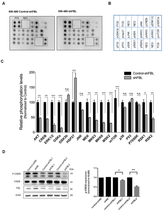 Given that the MAPK pathway is a key signaling cascade downstream of ribosome biogenesis, we selected the human MAPK array (RayBiotech, Inc.®, Peachtree Corners, GA, USA) to investigate signaling molecules potentially involved in FBL-mediated migration of SW-480 cells. FBL inhibition reduced the activation of key signaling molecules in the MAPK/ERK, PI3K/AKT, and JNK/p38 pathways, except for a slight increase in phosphorylated GSK3b and Ser15-phosphorylated P53 (Figure 7A,B). Among transcriptional regulators, HSP27 phosphorylation increased, while phosphorylated CREB significantly decreased (Figure 7C). To confirm the role of FBL in regulating CREB activity, we performed a Western blot analysis in SW-480 cells. While total CREB levels remained unchanged, phosphorylated CREB was significantly reduced upon FBL inhibition (Figure 7D), validating the phosphorylation array results. These findings suggest that FBL inhibition is associated with reduced CREB phosphorylation and MAPK pathway activity, which may contribute to the impaired migration of SW-480 cells.