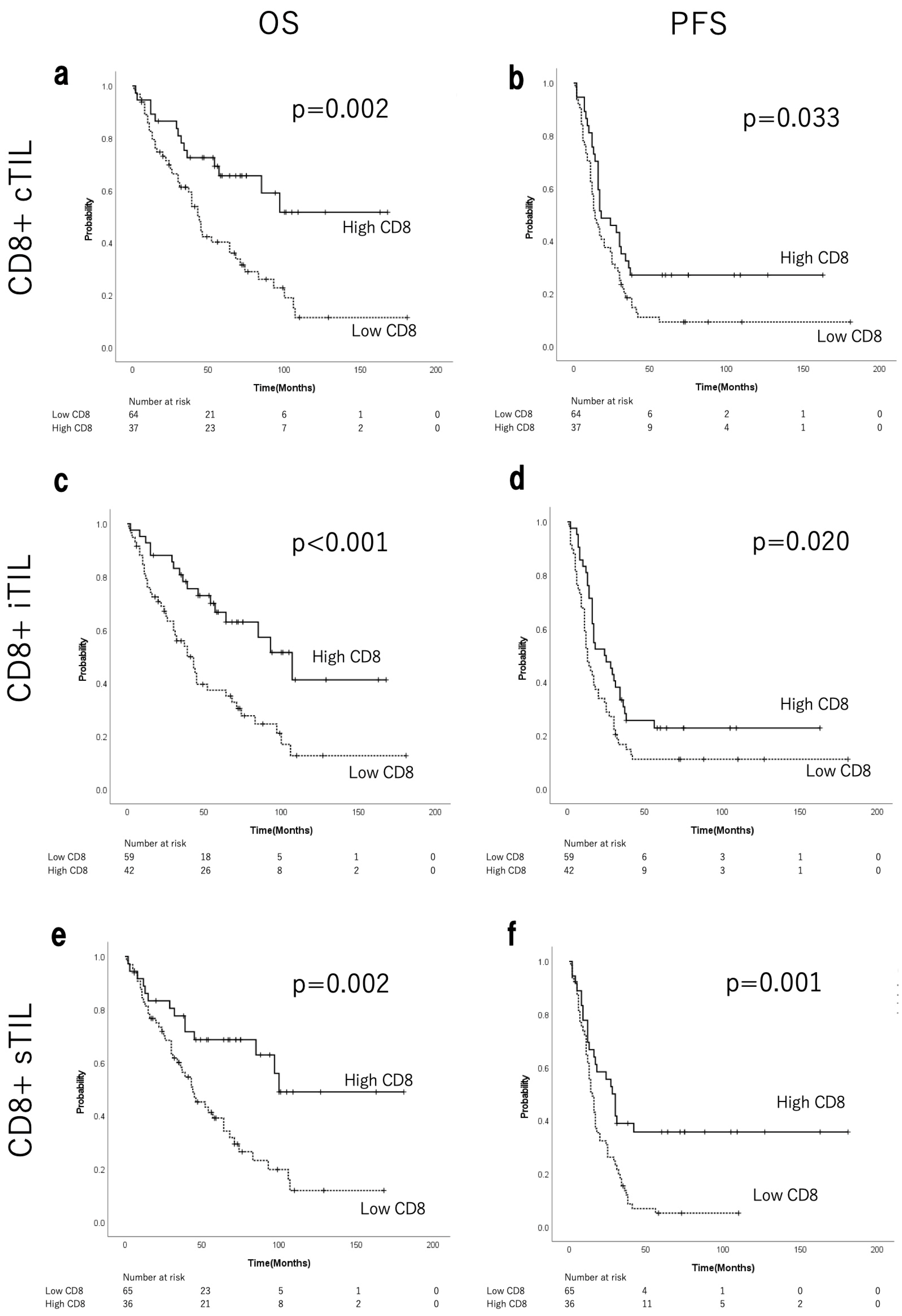 | High CD8+ iTILs (N = 25) | Low CD8+ iTILs (N = 16) | High CD8+ iTILs (N = 34) | Low CD8+ iTILs (N = 26) | p-Value | ||