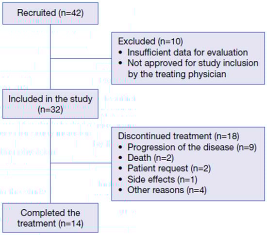Overall, 42 patients were included in the study; however, ten patients did not have sufficient data for evaluation and/or were not approved for study inclusion by the treating physician (Figure 1).