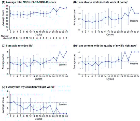 In total, 149 NCCN-FACT-FKSI-19 questionnaires were completed by patients treated with tivozanib. Per cycle, a minimum of 1 questionnaire and a maximum of 22 questionnaires were completed. The overall completion rate of the NCCN-FACT-FKSI-19 was 76.8% (Figure 2 and Figure S1). At baseline, questionnaire completion rate per patient was 100% (n = 32); however, the number of patients completing the questionnaire decreased over the course of the study. For all 19 QoL items evaluated using the PRO questionnaire NCCN-FACT-FKSI-19, there was no decrease in the mean score with increasing cycles (Figure 2A). For the sub-scales ‘I am able to work (include work at home)’, ‘I am able to enjoy life’, and ‘I am content with the quality of my life right now’, mean NCCN-FACT-FKSI-19 scores generally increased from cycle 2 to cycle 34 (Figure 2B–D). For the sub-scale ‘I worry that my condition will get worse’, the mean NCCN-FACT-FKSI-19 score generally decreased from cycle 2 to cycle 34 (Figure 2E). For the remaining 15 NCCN-FACT-FKSI-19 scores, the same trend of improvement over time was observed (Figure S2).