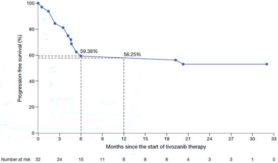Clinical response rate was reported in 15 patients (46.9%), with six patients (18.8%) achieving a complete response and nine patients (28.1%) a partial response (Table 3). Stable disease was reported in four patients (12.5%), giving a clinical disease control rate of 59.4%. Progressive disease in patients without prior response was observed in nine patients (28.1%). The clinical progression-free survival rates were 59.4% after 6 months and 56.3% after 12 months of tivozanib treatment (Figure 3); median clinical progression-free survival was not reached. Treatment with tivozanib was discontinued in 11 patients (34.4%); 9 (28.1%) discontinued due to disease progression and two patients (6.3%) died while receiving study treatment.