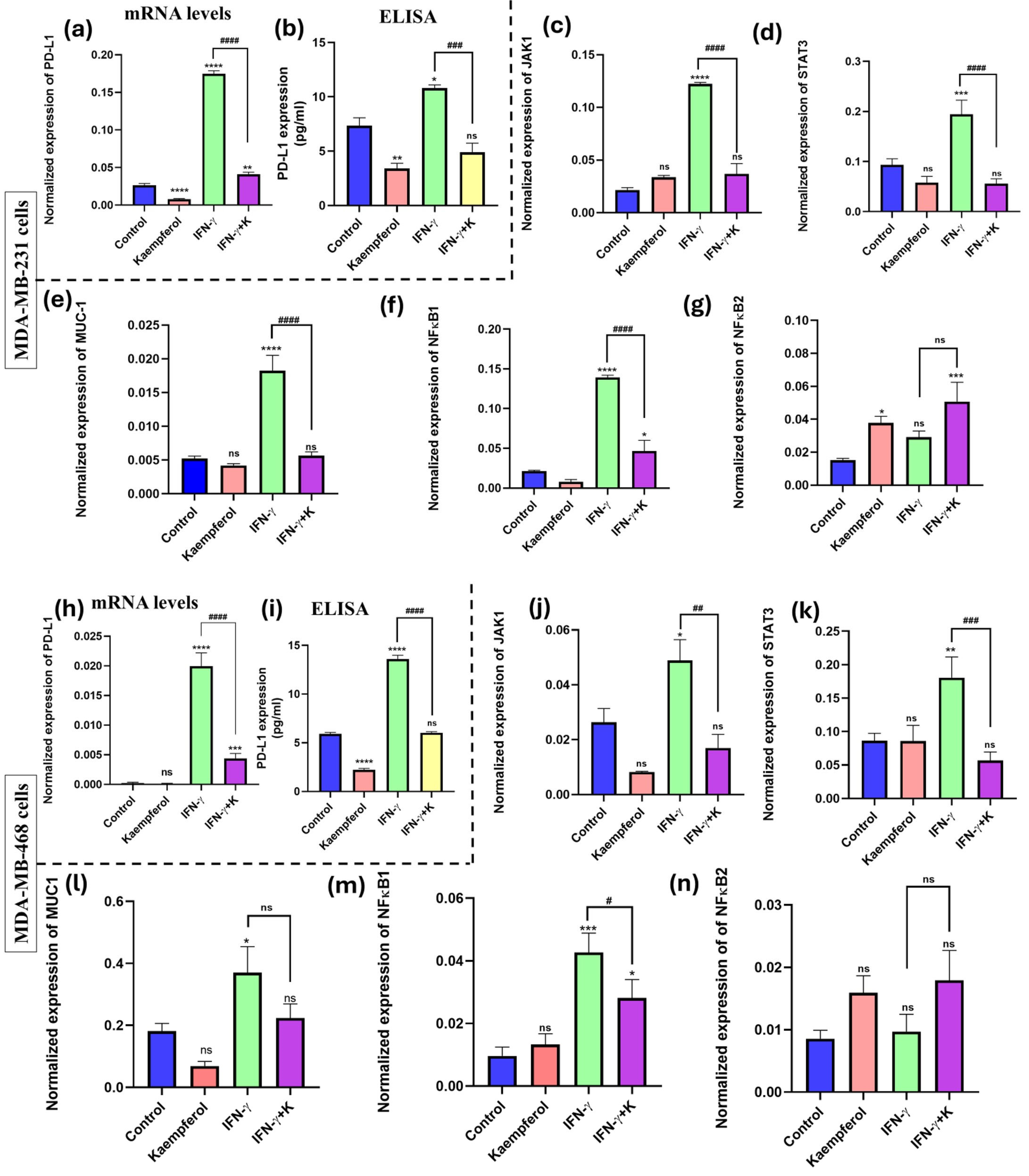 3.6. Effect of Kaempferol on mRNA Expression and Protein Release of PD-L1 and Its Inducers
