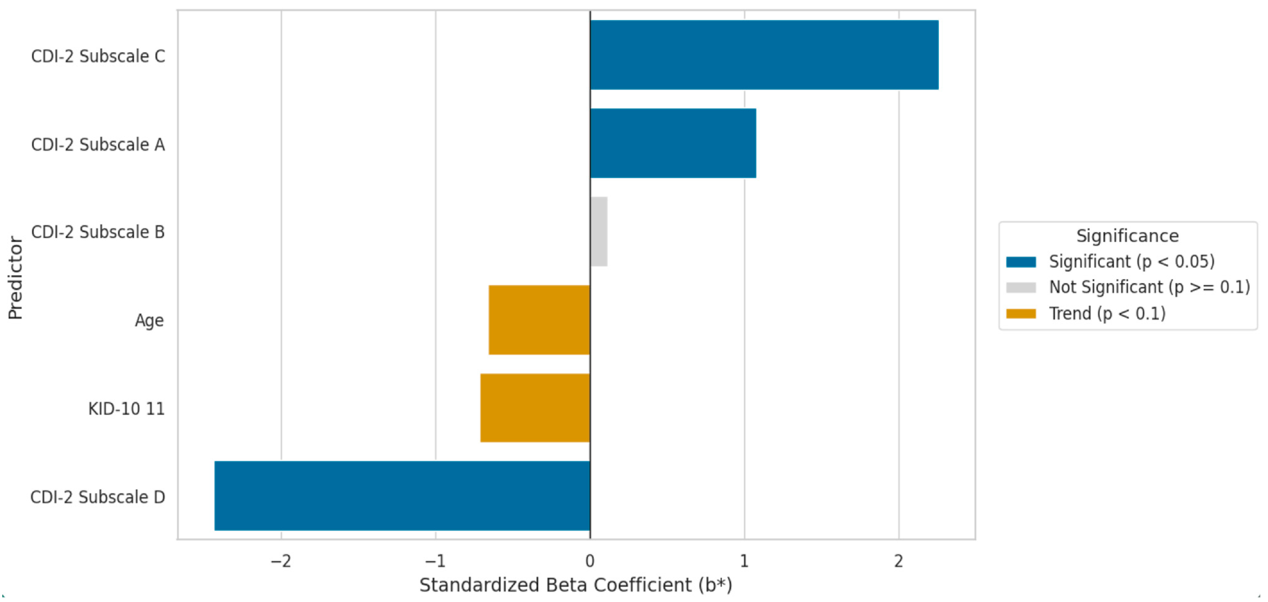 Figure 2), four statistically significant predictors were identified. Similar to the Younger Group, the key predictors with the greatest influence were CDI-2™ subscale D (Interpersonal Problems, b* = −3.05;
