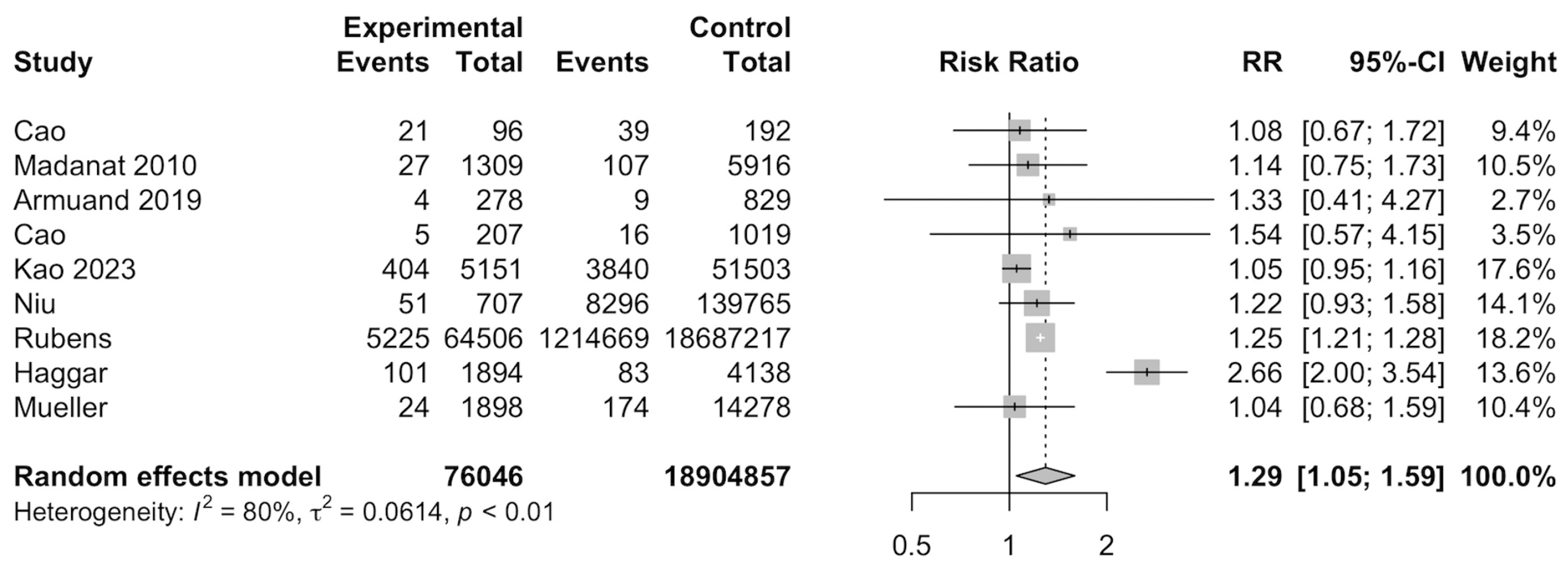 Nine studies [13,14,26,28,29,33,36,37,38] were included for meta-analysis to evaluate the RR of gestational diabetes among cancer survivors. Meta-analysis of the nine studies indicated that cancer survivors had a significantly increased risk of developing gestational diabetes (RR: 1.29, 95%CI: 1.05–1.59) (Figure 3). A total of 18,980,903 individuals were investigated and 1233,095 developed gestational diabetes. Subgroup analyses found that North American studies showed a significantly increased risk ratio for developing gestational diabetes (RR: 1.25, 95%CI: 1.21–1.28), when compared to European countries (RR: 1.21, 95%CI: 0.84–1.74) and Asian countries (RR: 1.05, 95%CI: 0.96–1.16). Other categorical variables, such as type of control, type of cancer, age of diagnosis, age of delivery, and smoking, were insignificant (Supplementary Table S3). Meta-regression was also insignificant (Supplementary Table S4).