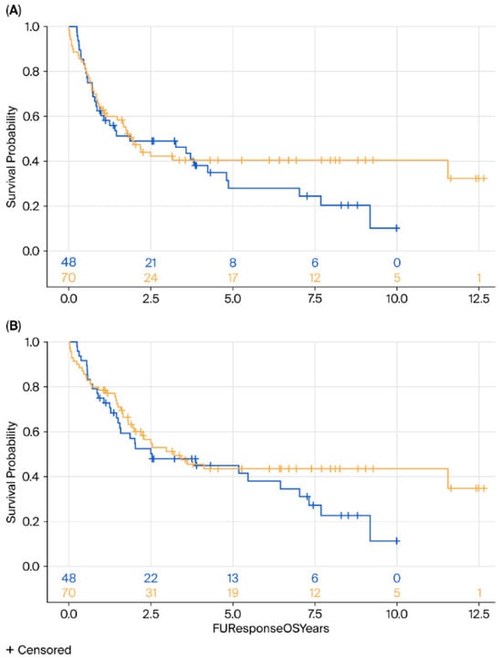 Kaplan–Meier survival analysis of (A) DFS and (B) OS of patients aged 70 and younger comparing surgery (yellow) vs. surveillance (blue).