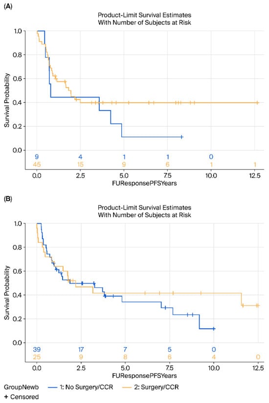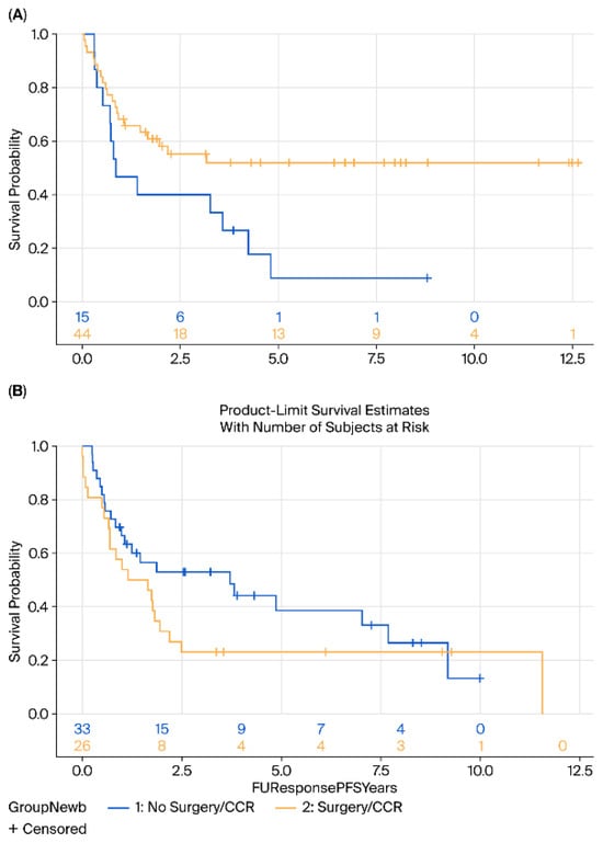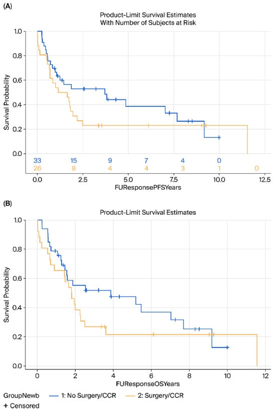 In contrast, among patients >70 years, no significant differences in OS (HR = 1.4, 95% CI 0.7–2.6, p = 0.25) or DFS (HR = 1.44, 95% CI 0.7–2.6, p = 0.20) were observed; indeed, a trend toward inferior outcomes with surgery was noted in this older cohort (Figure 5).