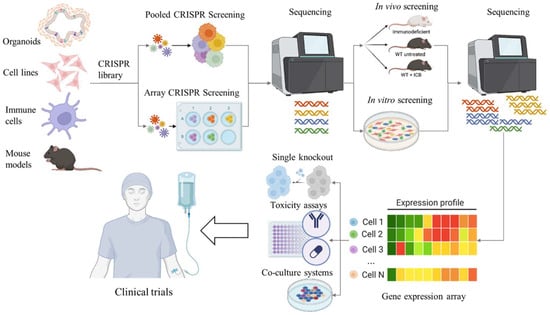 Schematic representation of the CRISPR/Cas9 workflow in the discovery and validation of novel immunotherapy targets for CRC. CRISPR screens can and have been performed on cell lines, organoids, immune cell populations, and mouse models. Initial CRISPR screens can be performed using pooled or arrayed libraries. Baseline sequencing is performed prior to immune pressure which could be conducted in vivo using immunocompetent mice, treating with immunotherapies, or using a co-culture system. Sequencing of the tumours or cells after intervention provides a list of potential target genes. The genes can be validated using conventional molecular techniques. Targeted therapies can then be established and tested in a clinical environment.