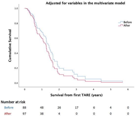 The median time from mapping to the first TARE procedure was 7.5 days (IQR: 1 to 23) for the overall cohort. Prior to OMT implementation, this interval was significantly longer at 21 days (14 to 33), compared to 1 day (1 to 5) after OMT (p < 0.001). However, the mapping to TARE interval was not significantly associated with overall survival (HR: 1.002; 95% CI: 0.999 to 1.005; p = 0.160).
