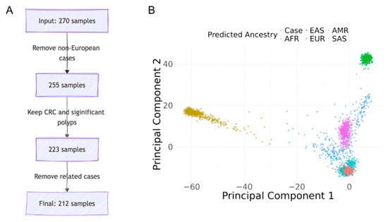 Case selection and ancestry predictions. (A) Case selection process: from 270 individuals to the final cohort. (B) Principal component analysis for ancestry predictions in the SAYO cohort.