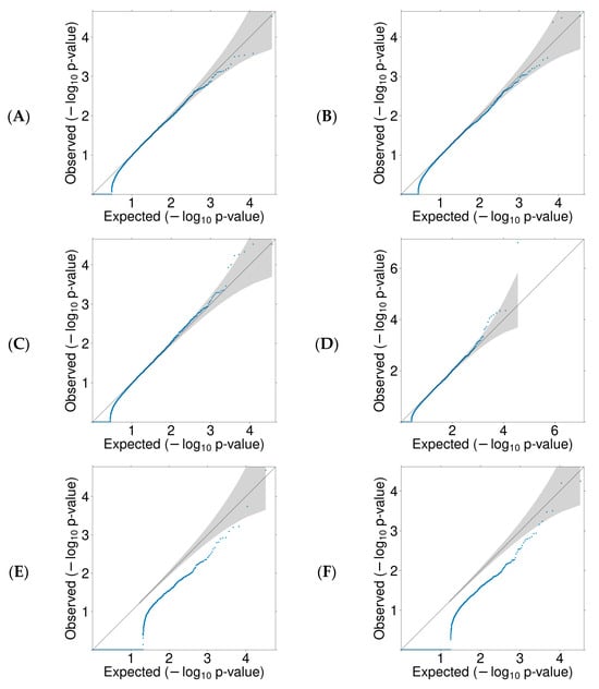 QQ plots for missense and/or LoF variants burden test. Each blue dot represents a gene, and the 95% confidence intervals are shaded. (A) missense in CRC, (B) missense in CRC and significant polyps, (C) missense and LoF in CRC, (D) missense and LoF in CRC and significant polyps, (E) LoF in CRC, (F) LoF in CRC and significant polyps.