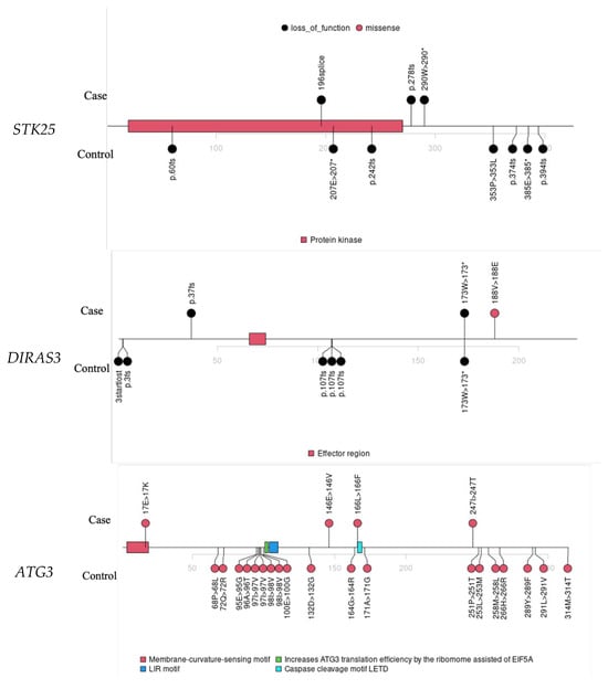 Lollipop plots for variants in STK25, DIRAS3, ATG3, RPS6KA4, and DDX42.