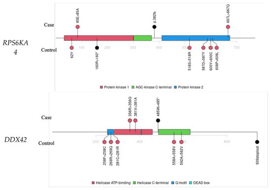 DDX42 showed significant enrichment of risk variants in CRC cases (Table S5), with a relative risk of 61.1 and a p value of 5.4 × 10−5 at a VEST4 threshold of 0.88, as shown in Table 3. In Figure 3, all three variants in cases cluster within biologically critical regions: two missense variants fall in the Helicase ATP-binding domain, and one stop-gained variant lies near the Helicase C-terminal domain, where truncation is likely disruptive.